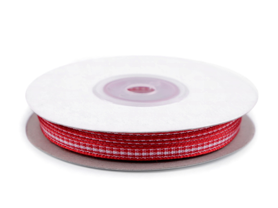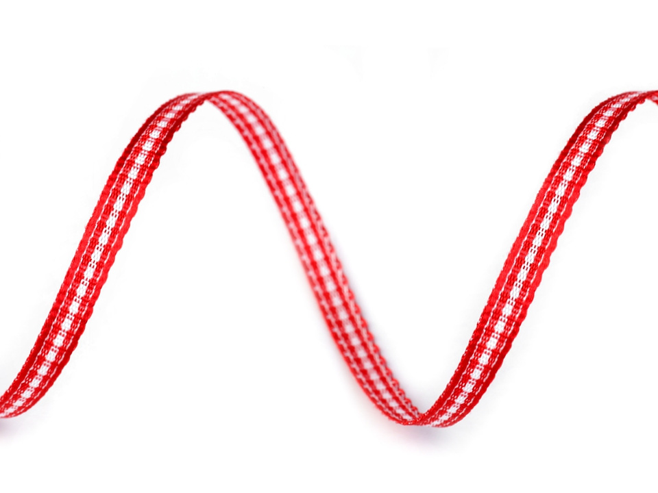 Tenká stuha s károvaným vzorem, je pevná a příjemná na dotek.