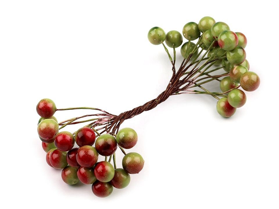 Plastová dekorace v podobě bobulí je vhodná k aranžování. Dekorace je oboustranná - na každém konci drátku je připevněna jedna kulička.