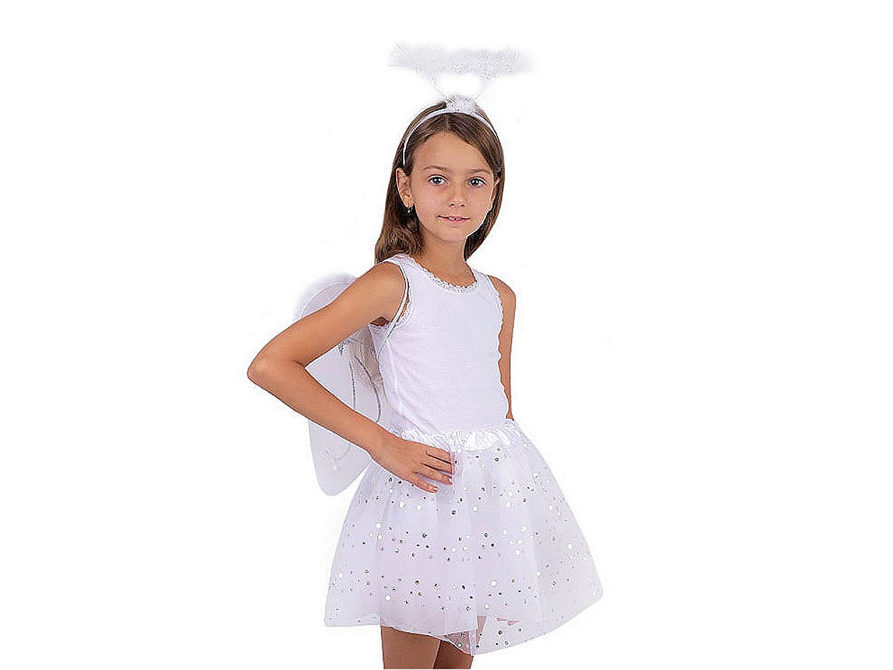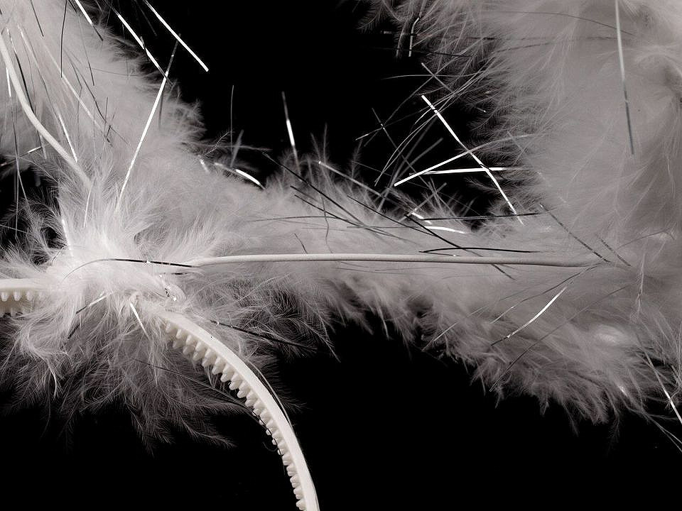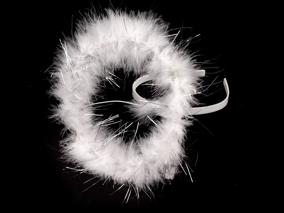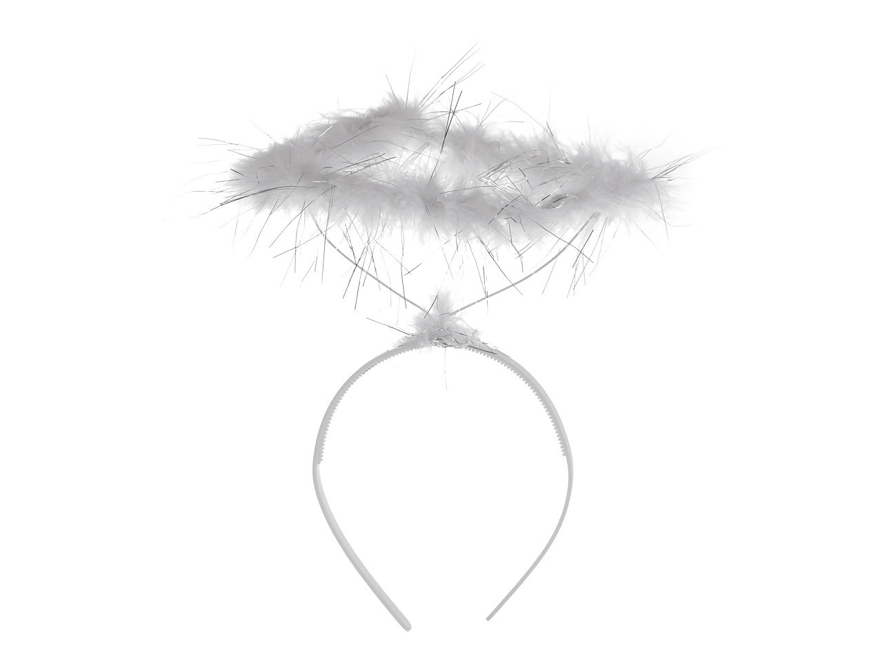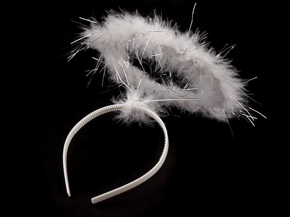 Svatozář je k plastové čelence připevněná pomocí bílých drátů. Díky nim si ji můžete natáčet a tvarovat do různých poloh. Samotná aureola je vyrobená z drátu potaženého péřovou girlandou, ve které jsou vetkané stříbrné lamely. Díky nim se nebesky třpytí.