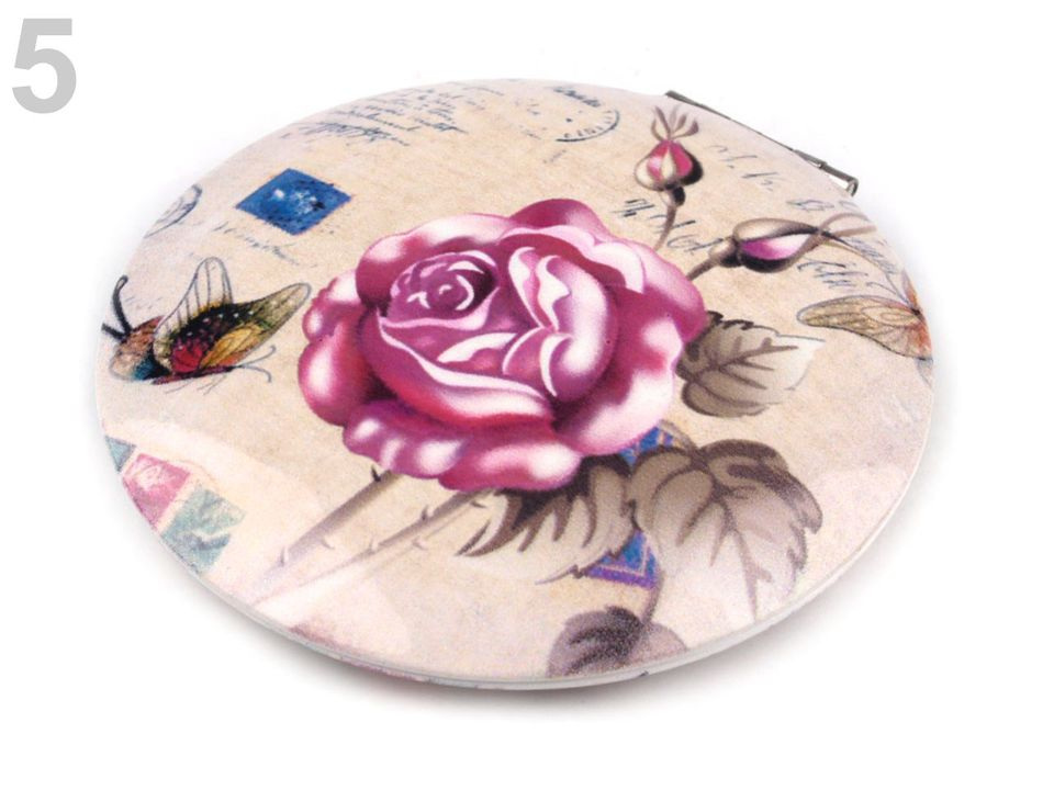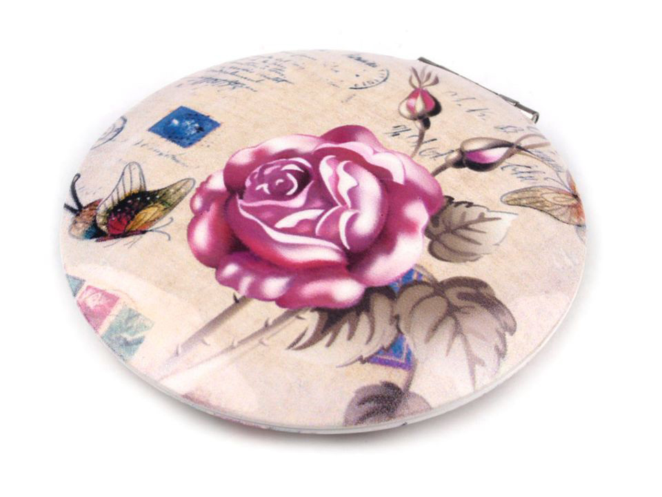 Pouzdro je rozevírací, ukrývá jedno zrcátko klasické, druhé zvětšovací. Zavřené drží pomocí magnetu. Vyniká kvalitním kovovým zpracováním. Je zdobené motivy růží s nápisy ve stylu vintage.