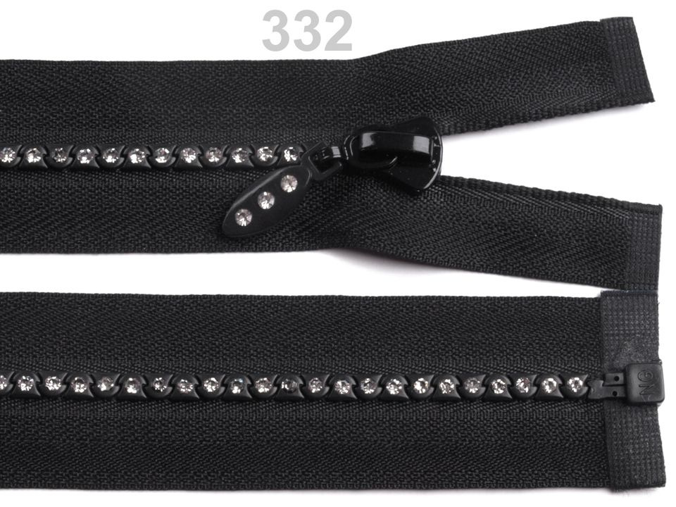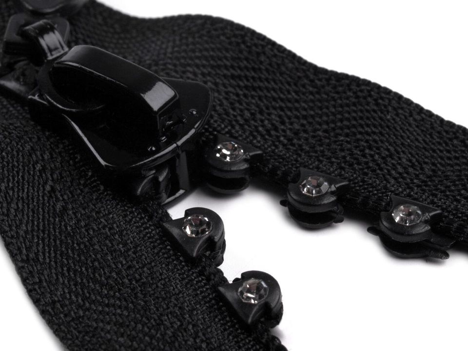 Dělitelný kostěný zip zdobí plastové broušené kamínky. Využijete ho k našití na bundy, svetry, mikiny apod.