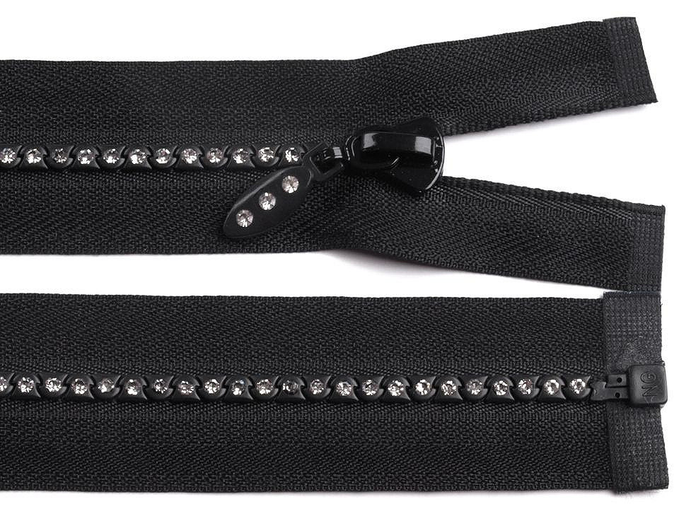 Kostěný zip má jednotlivé zoubky i běžce ozdobené broušenými kamínky. Je dělitelný. Můžete ho našít na bundy, svetry, mikiny apod.