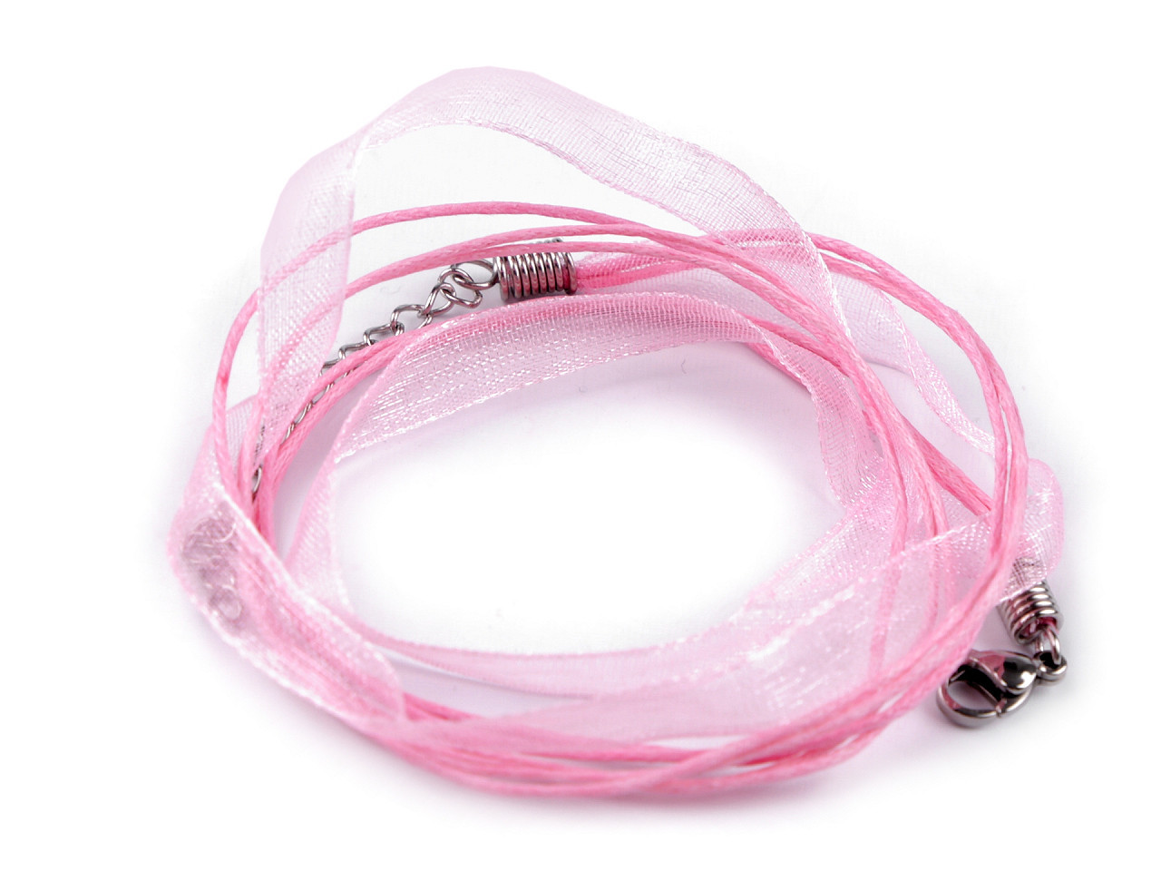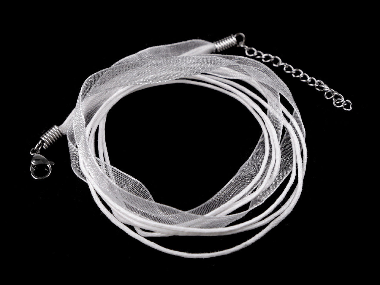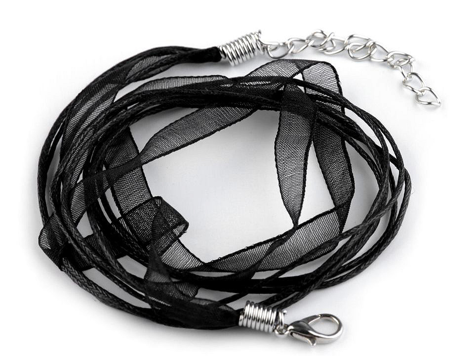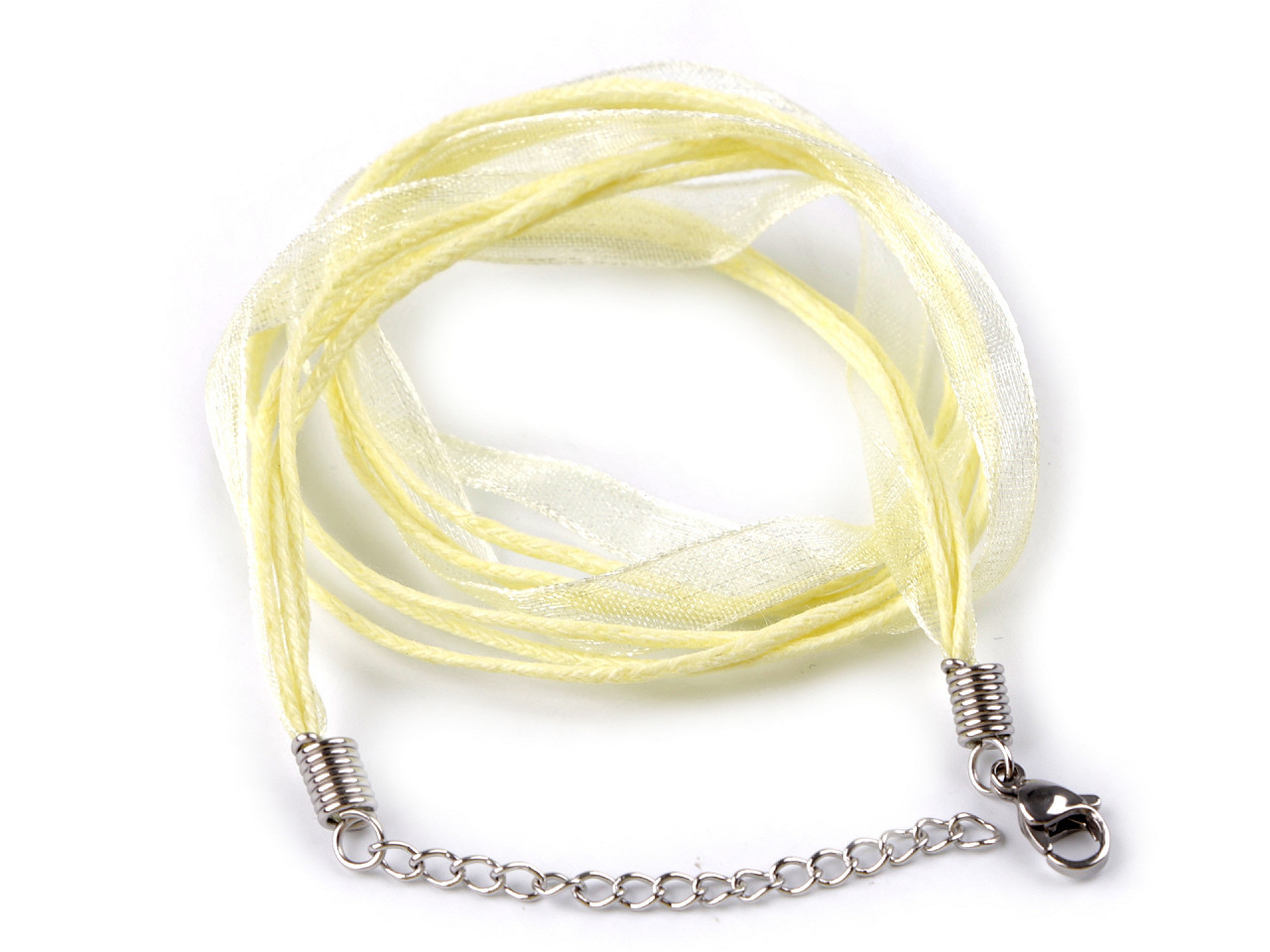 Hotový závěs z organzové stužky a tří voskovaných šňůrek je velice oblíbený. Stačí na něj zavěsit koupený nebo vlastnoručně zhotovený přívěsek. Zapíná se na klasickou karabinku a prodlužovací řetízek.