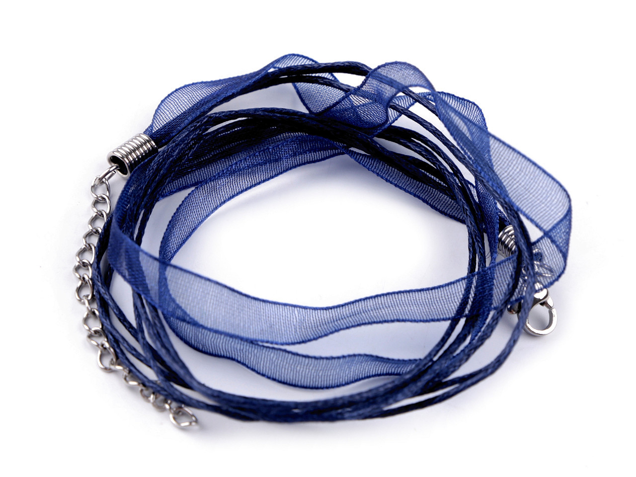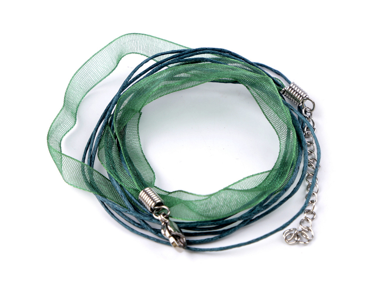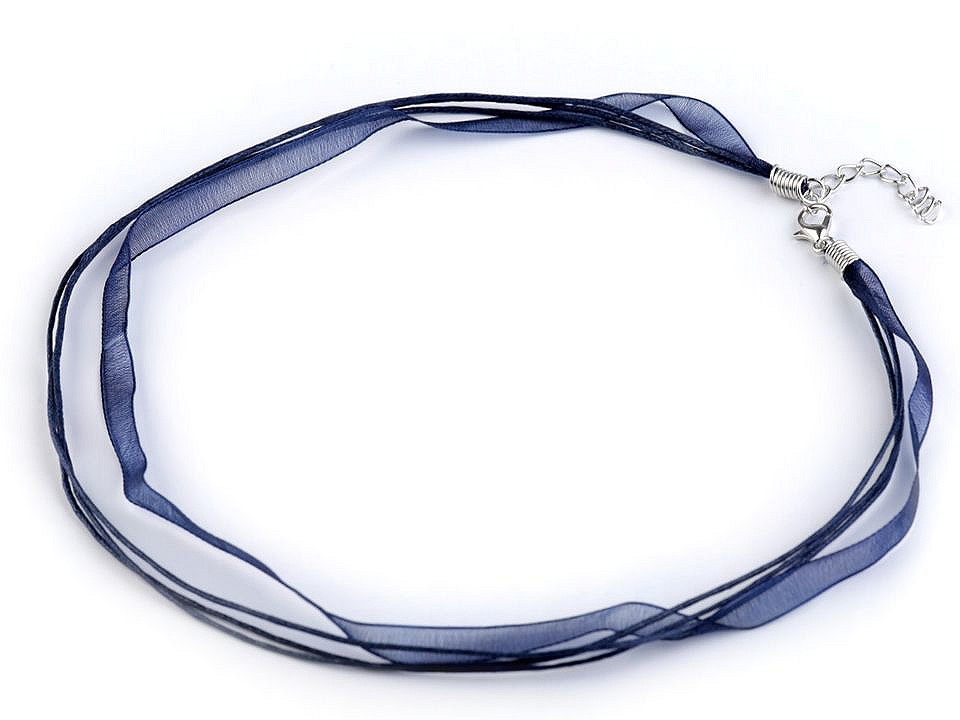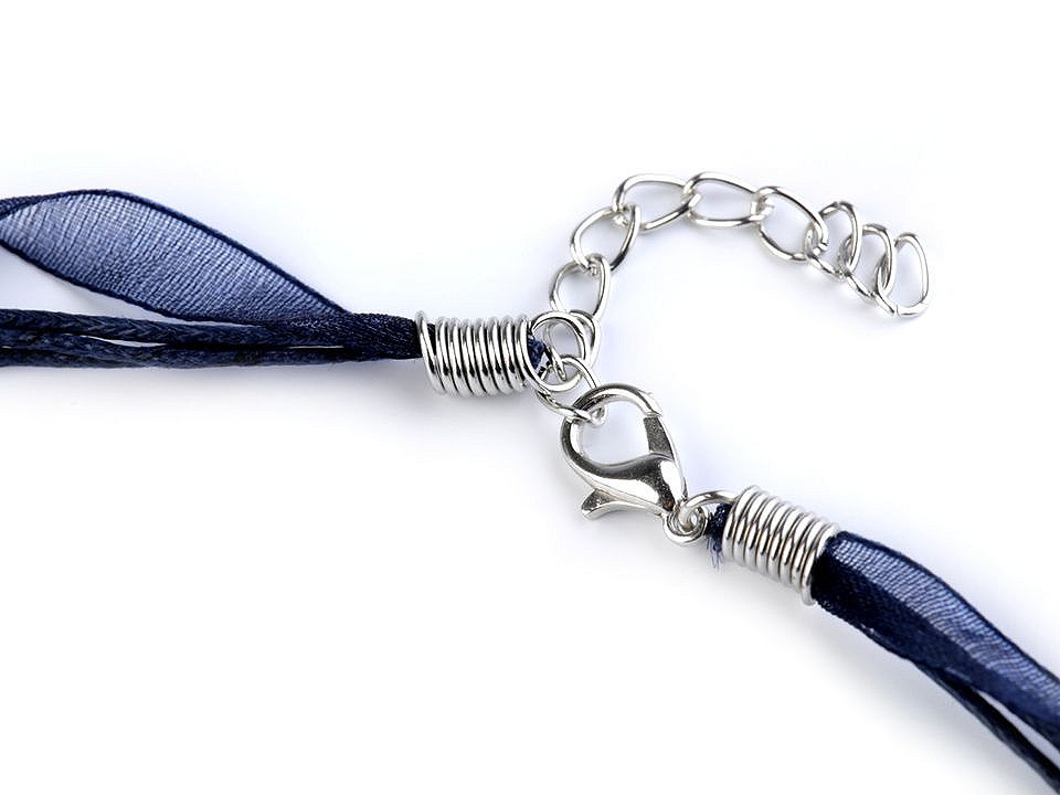 Hotový závěs z organzové stužky a tří voskovaných šňůrek je velice oblíbený. Stačí na něj zavěsit koupený nebo vlastnoručně zhotovený přívěsek. Zapíná se na klasickou karabinku a prodlužovací řetízek.