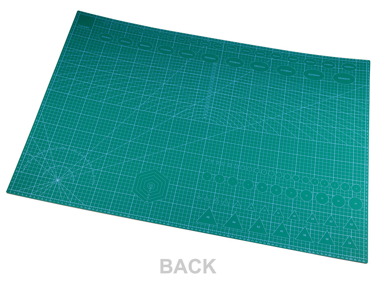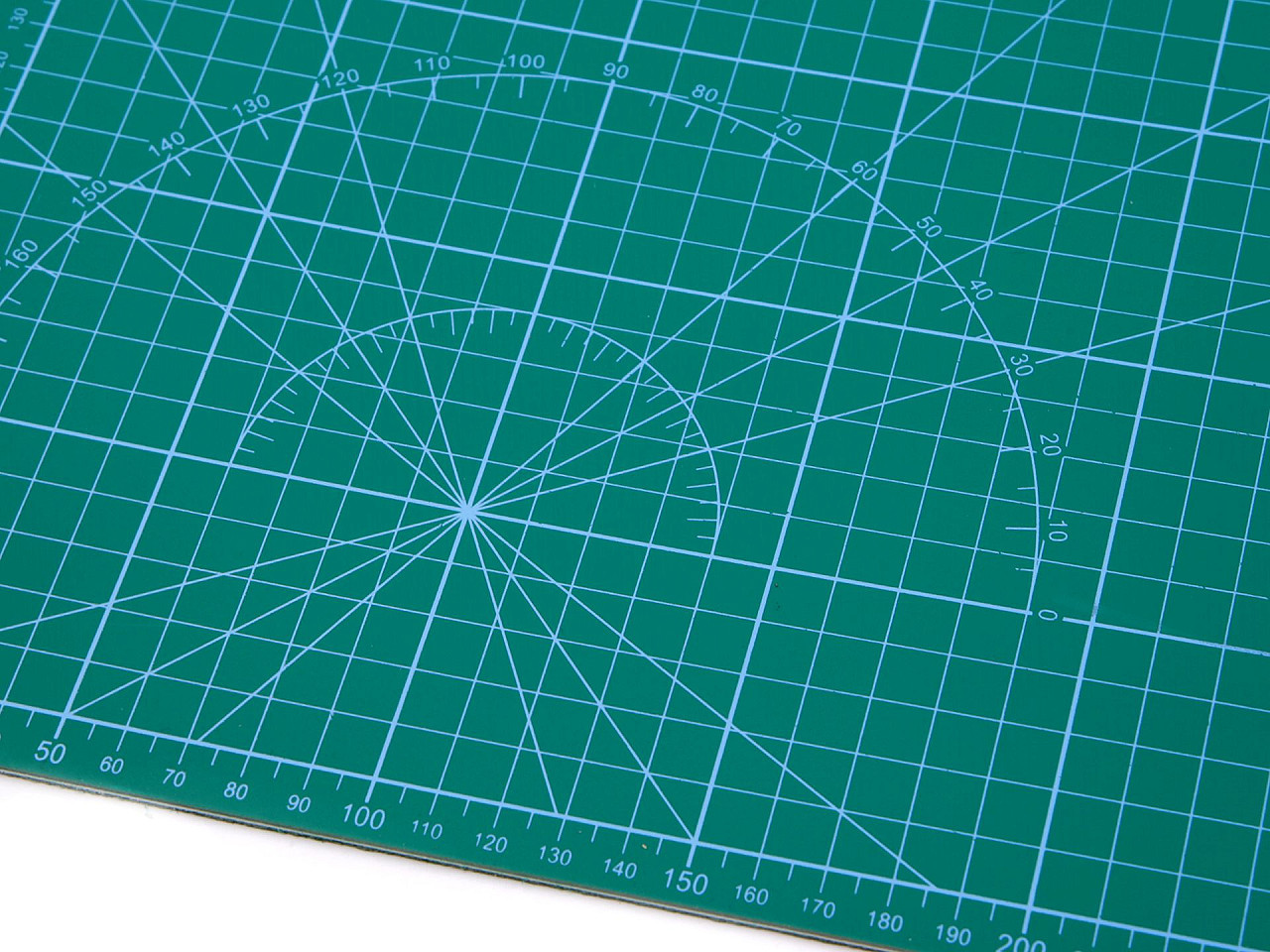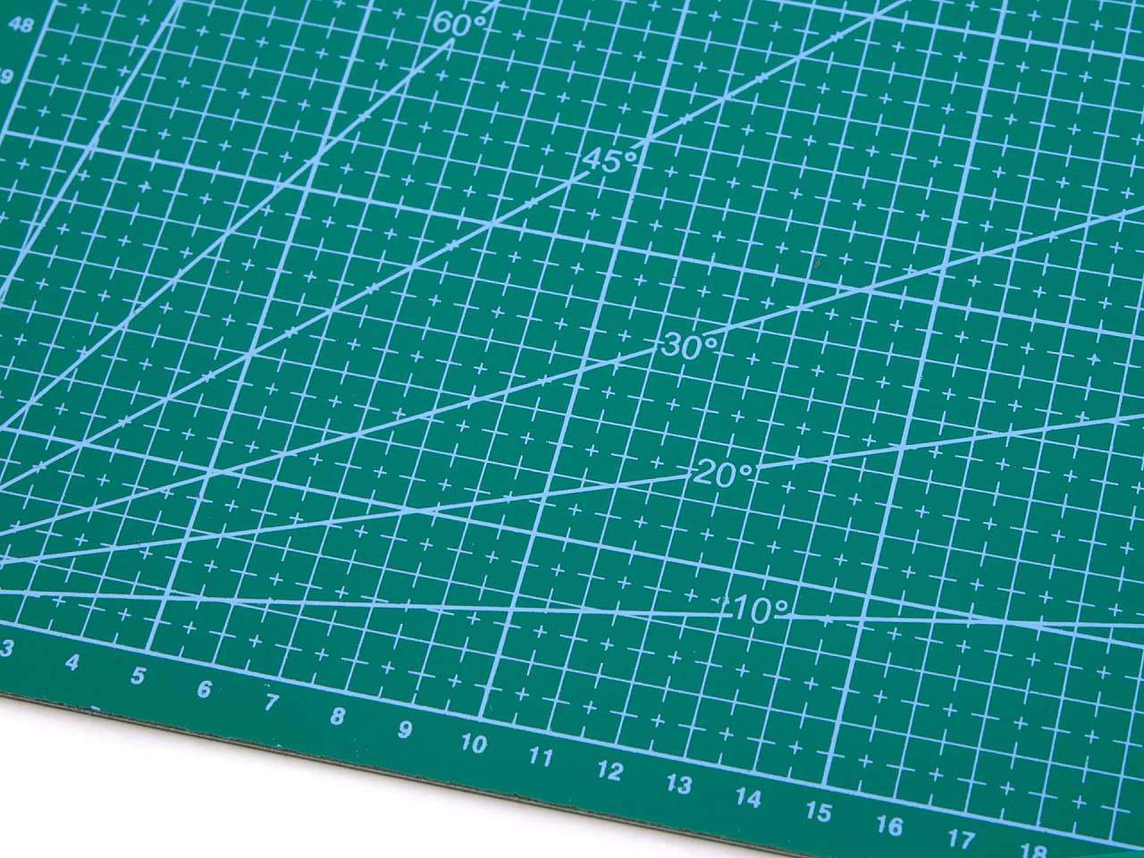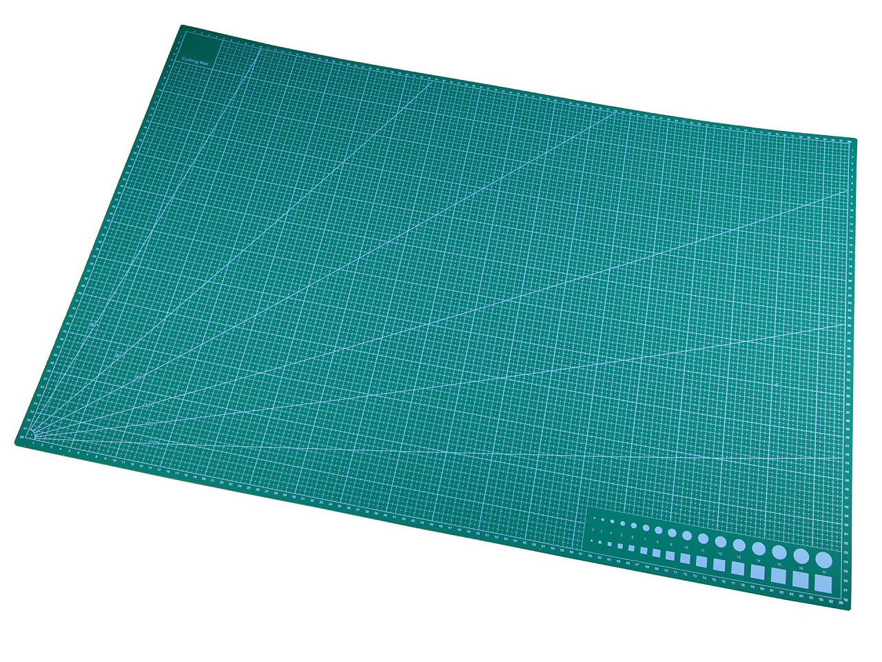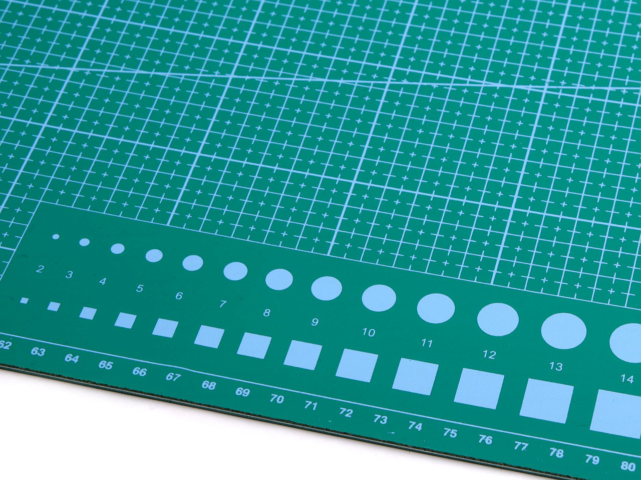 Je oboustranná, vyrobená z tvrdého materiálu, který brání přeříznutí, ale zároveň neztupí čepel nože. Na jedné straně podložky je vyznačená síť v cm s úhly. Také na ní najdete šikovnou vzorkovnici průměrů koleček a čtverečků od 2 mm do 9 mm. Druhá strana je rozměřená po 5 cm.