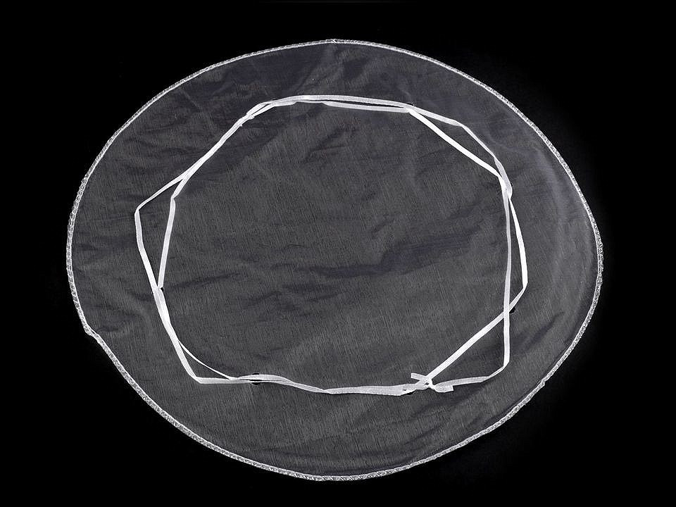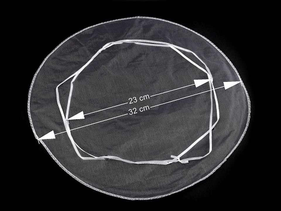 Průměr vnitřní části (od stuhy po stuhu) je 23 cm. Od stuhy po okraj je 4,5 cm.