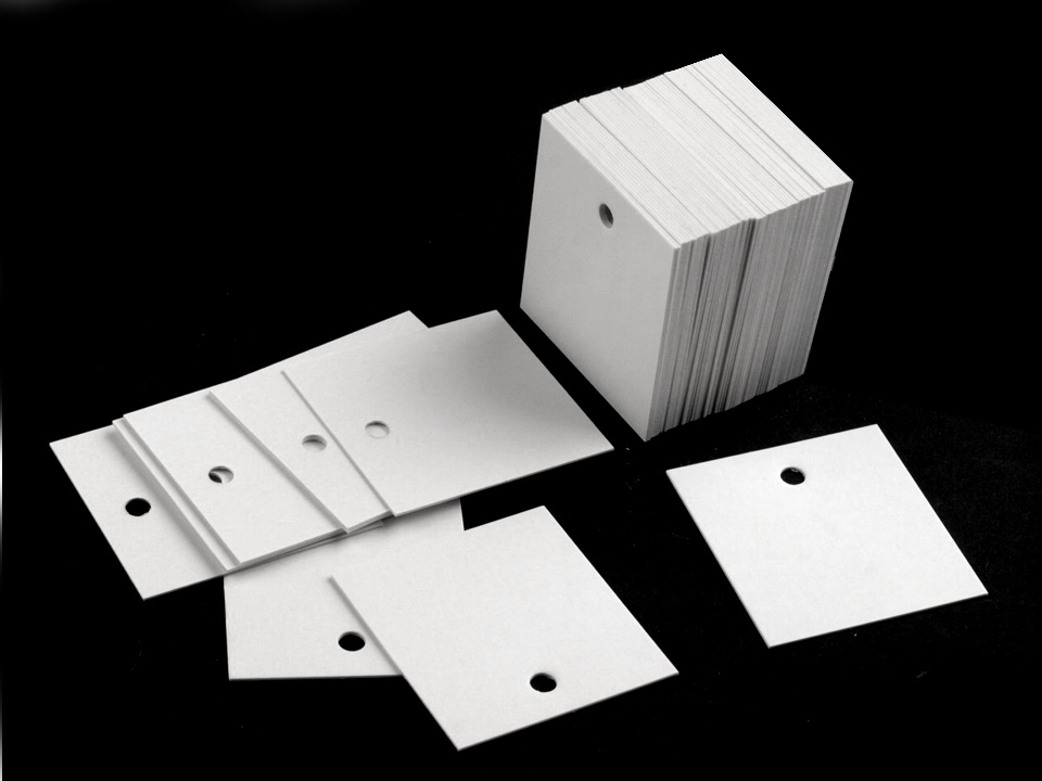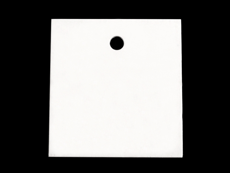 Je vyrobená z pevného papíru, horní strana je křídová, pololesklá. V horní části má vyražený kruhový otvor.