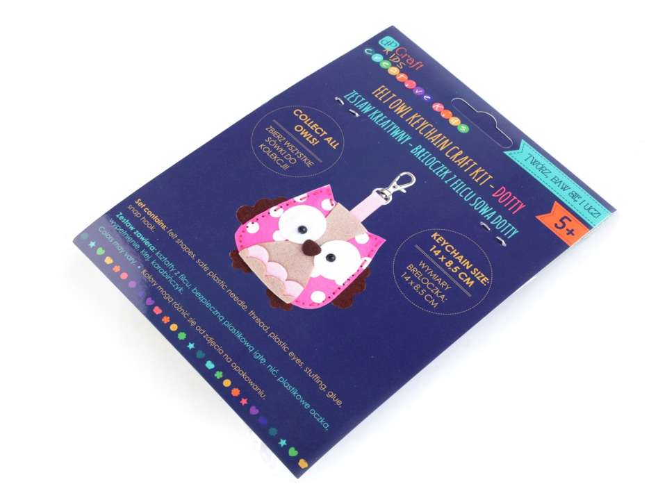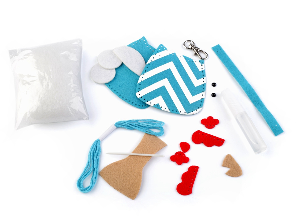 V kreativní sadě najdete vše potřebné od jehly přes výplň z dutého vlákna až po materiál na kompletní výrobu. Součástí balení je kovová karabina s otočnou hlavou. Díly, které se sešívají k sobě mají perforované okraje pro snadnější sešití. Jehla je plastová, ohebná, nepopíchá prsty.