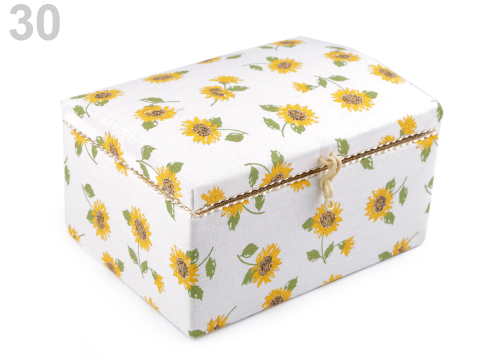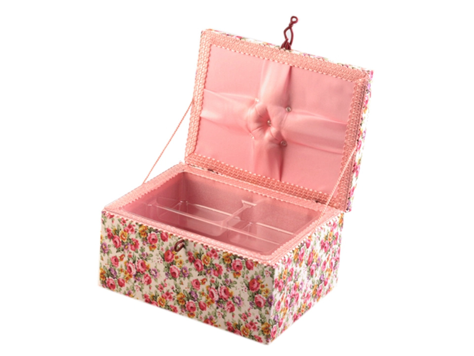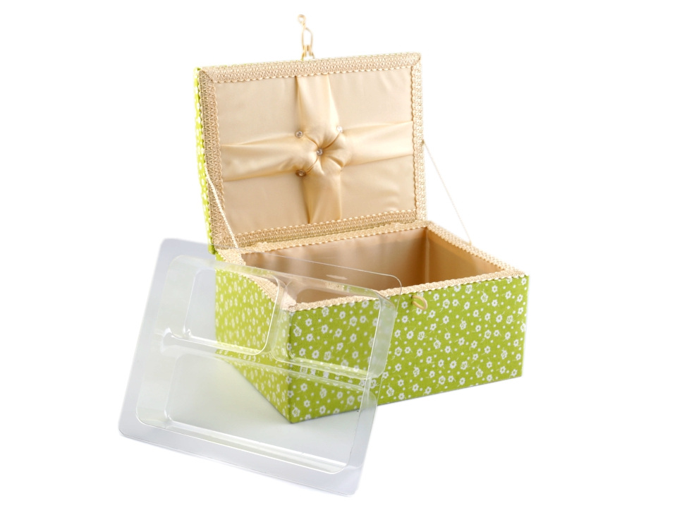 Do čalouňeného košíku se vám vejde plno šicích potřeb. Uvnitř se nachází odnímatelné patro z průhledného plastu, které má tři přihrádky. Design košíků je laděný do květinových motivů.