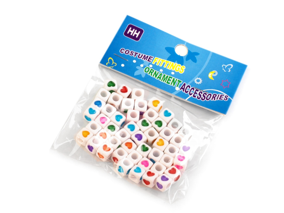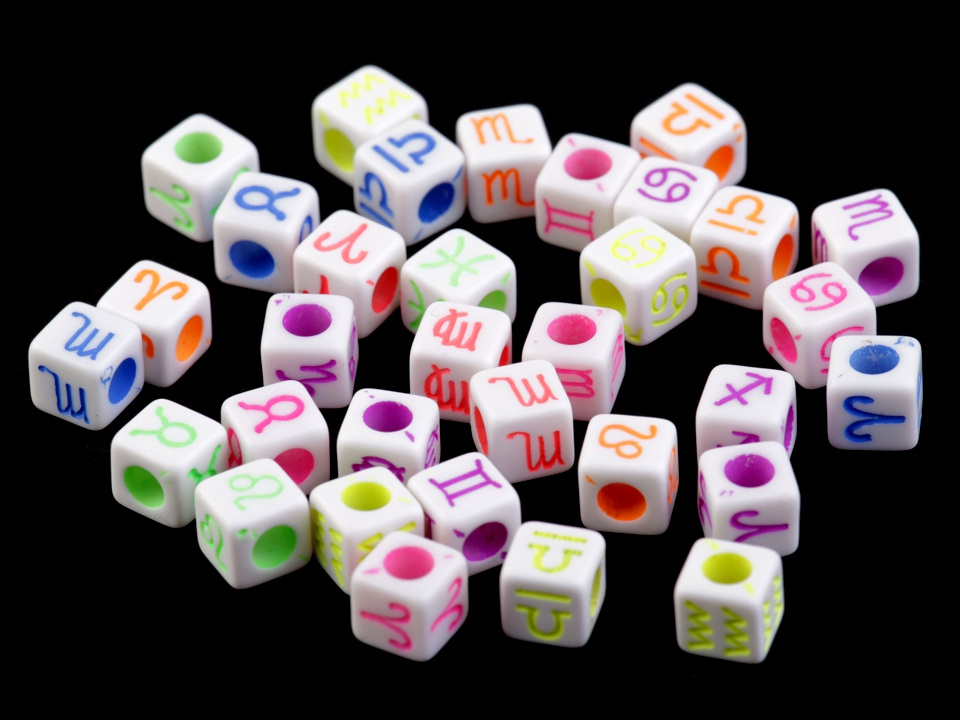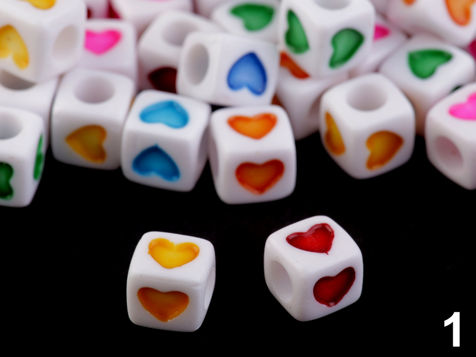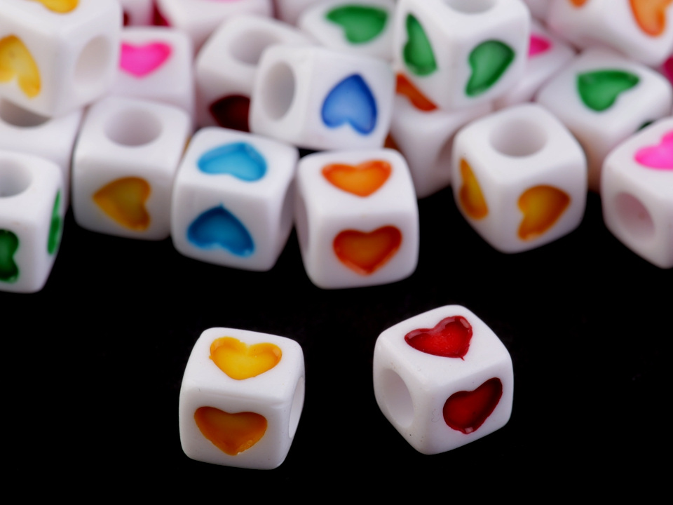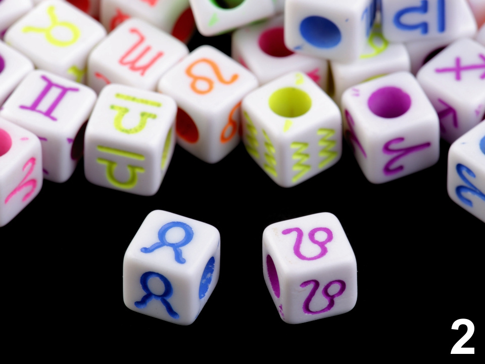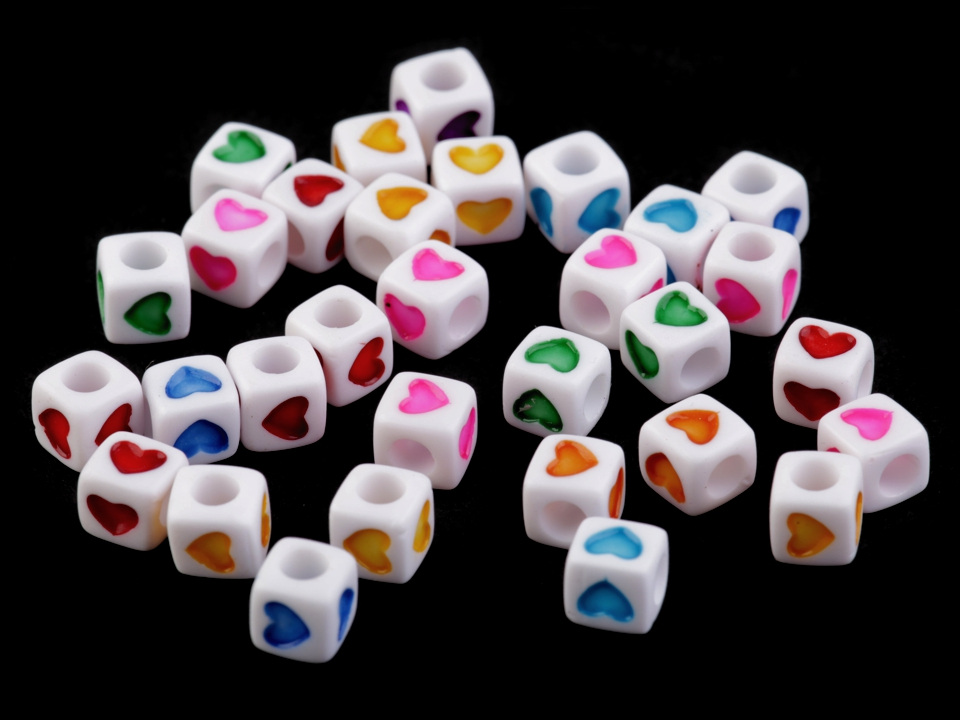 Korálky s obrázky potěší především školní děti. Mohou vyrábět populární náramky přátelství se srdíčky nebo znamením zvěrokruhu. Korálky mají tvar kostky. Tělo korálku má bílou barvu, obrázky jsou barevné.
