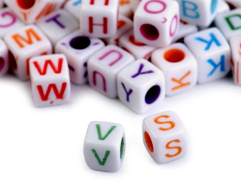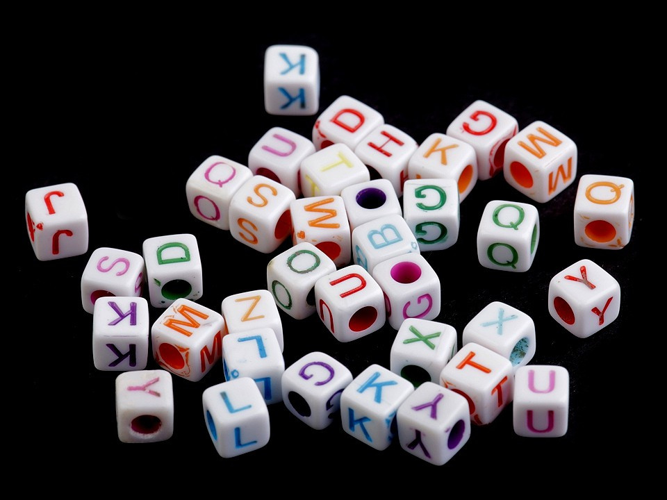 Korálky mají tvar kostky. Písmena jsou na všech ploškách, chybí pouze na stranách s průvleky. Horizontálně umístěný průvlek umožňuje skládat z písmen slova, jména apod. Díky velkého průvleku se korálky hodí i na gumičkové náramky. Tělo korálku má bílou barvu, písmena jsou barevná.