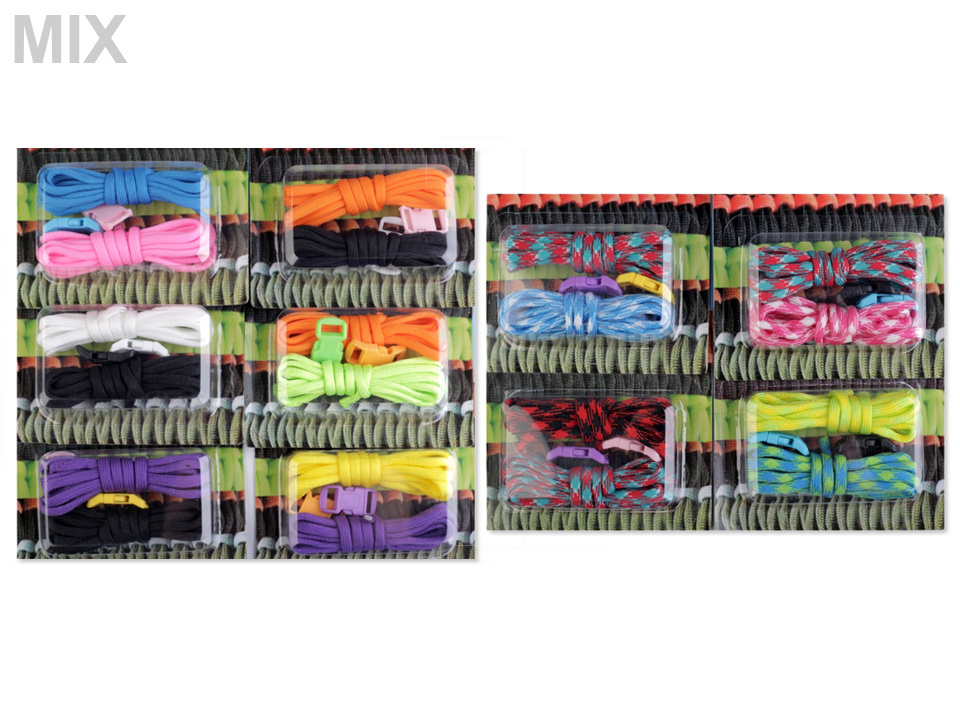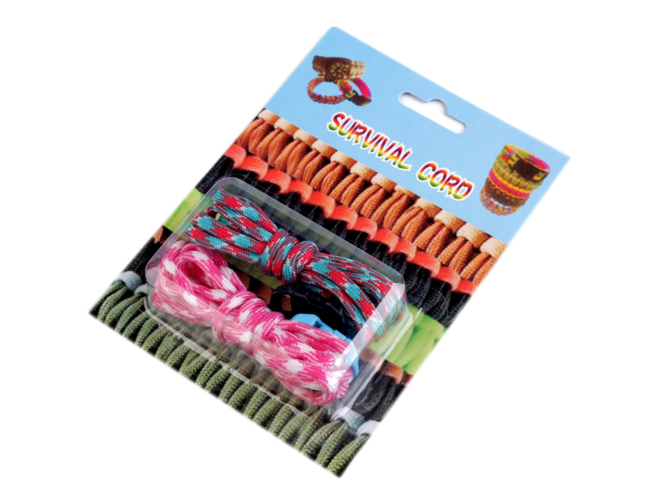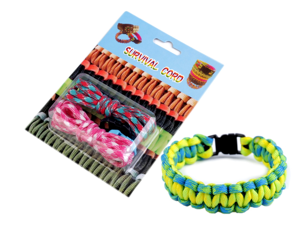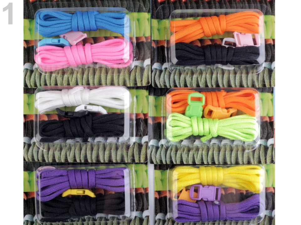 V sadě najdete 2 šňůry s barevným opletem. Uvnitř je jádro složené ze 7 vláken. Šňůry jsou dlouhé cca. 140 cm. Po ustřižení doporučujeme konce zatavit nad plamenem. Vystačí na upletení jednoho dvoubarevného náramku - viz. foto. Dále jsou v sadě 2 zapínání. Na zadní straně balení je vytisknutý návod na upletení náramku. Pro inspiraci doporučujeme i náš návod na našem korálkové webu.