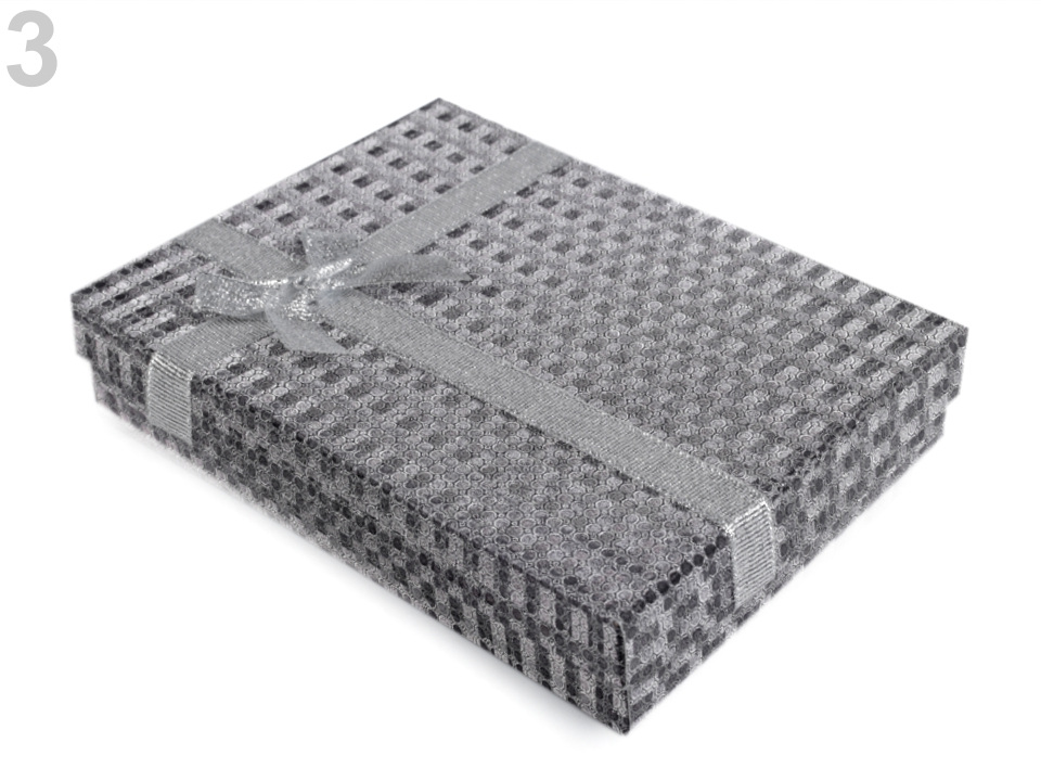 Papírová krabička s efektním vzhledem. Zdobí ji lurexová mašlička s kovovým leskem. Celý povrch je potažený
