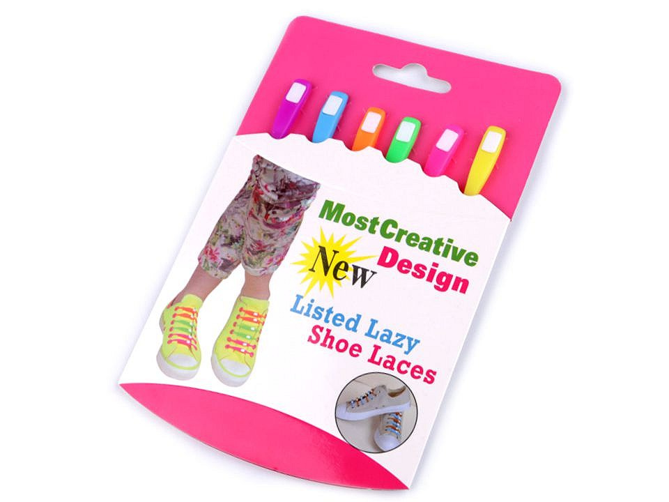 Na jedné kartě je 6 kusů tkaniček v neonových barvách. Konce tkaniček mají šířku 8 mm.