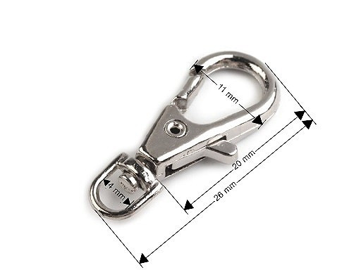 Kovová karabinka je připevněná na otočném obrtlíku. Je vhodná k výrobě klíčenek, případně k upevnění řetízků na menší kabelky nebo psaníčka.
