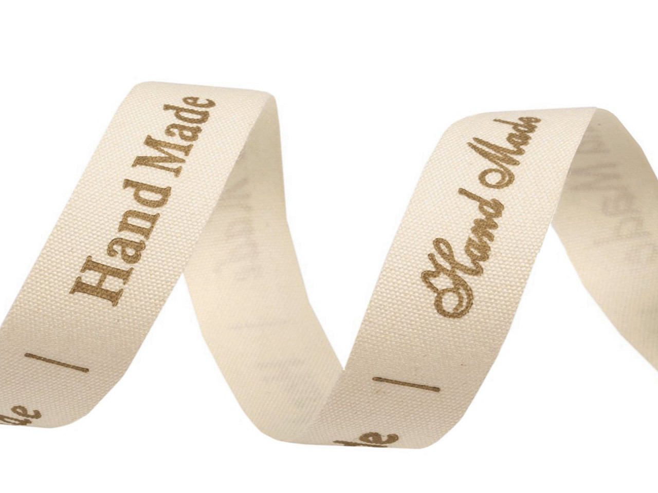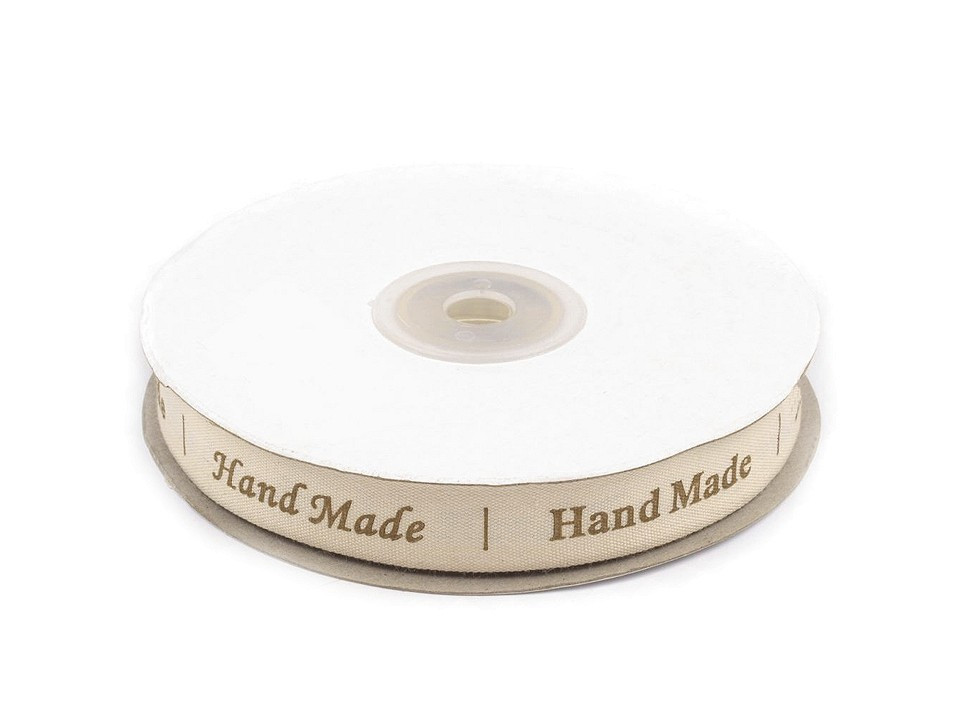 Bavlněnou stuhu zdobí nápis "hand made" ve tvaru štítku (15 x 55 mm). Nápis je v 7 stylech písma, které se pravidelně střídají. Stuha je pevná a příjemná na dotek.