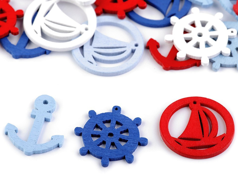 Dřevěné přívěsky s námořnickými motivy jsou stylovou dekorací. Můžete je nalepit na dřevěné kolíčky, použít je jako dekoraci ve scrapbookingu nebo je zavěsit na spojovací kroužek či šlupnu. Přívěsky jsou vhodné pro výrobu šperků i dekorativních předmětů.