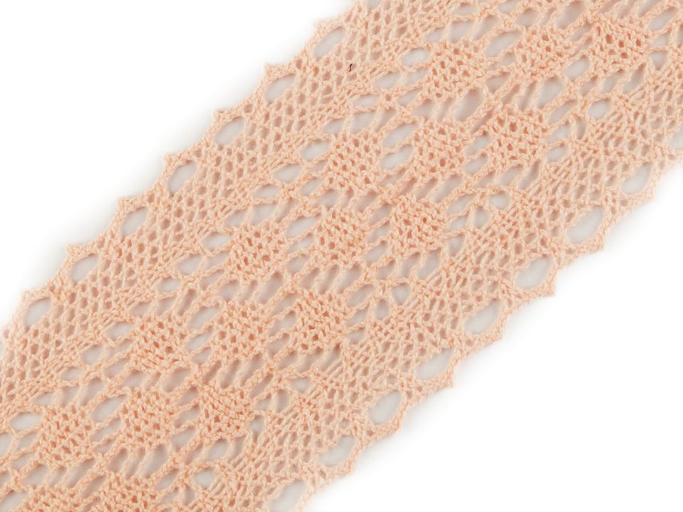 Bavlněnou paličkovanou krajku zdobí efektní vzor s kolečky. Doporučujeme ji žehlit přes tkaninu.
