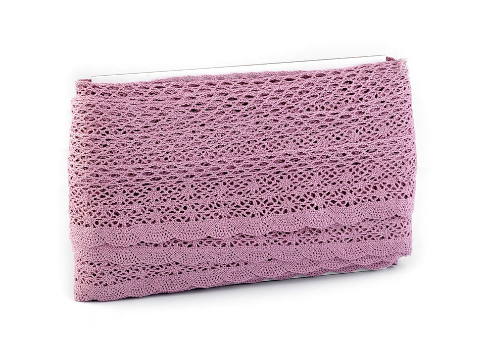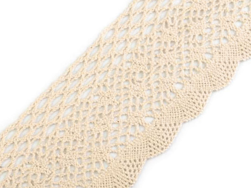 Široká paličkovaná krajka je vyrobena z bavlny. Z jedné strany ji zdobí pravidelný vlnkovaný vzor.