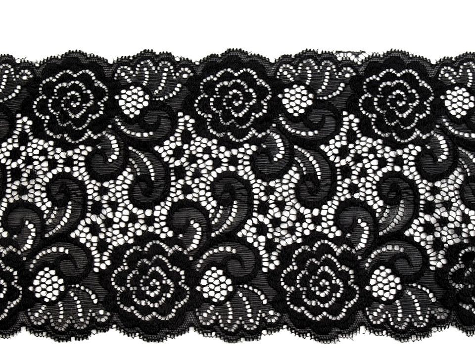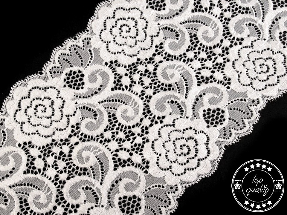 Elegantní krajka je pružná. Zdobí ji jemné květinové motivy.