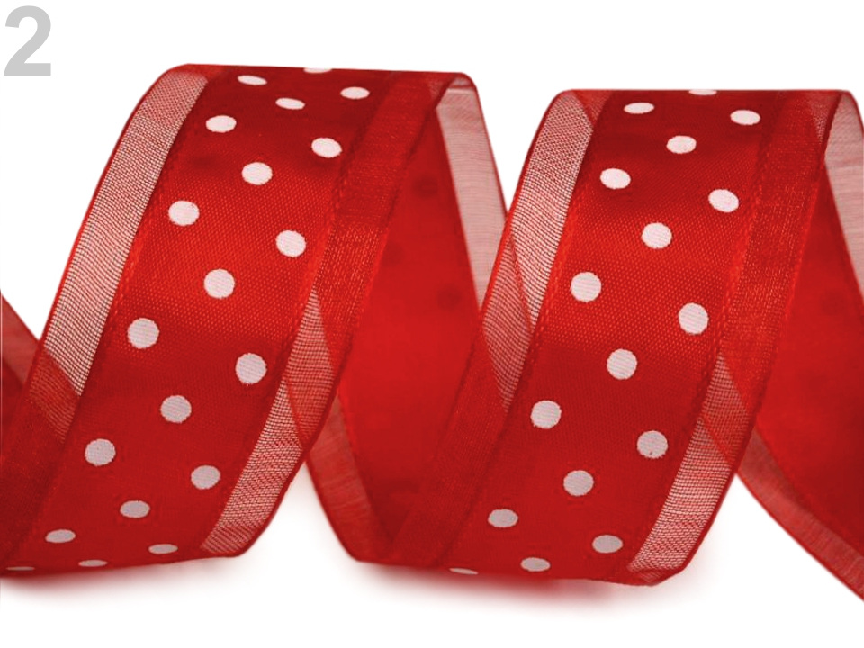 Puntíkovaná kombinovaná stuha má velice zajímavý design. Střed tvoří klasická neprůhledná atlasová stuha, po stranách je průsvitná šifonová stuha. Potisk puntíky s průměrem 2 mm je jednostranný.