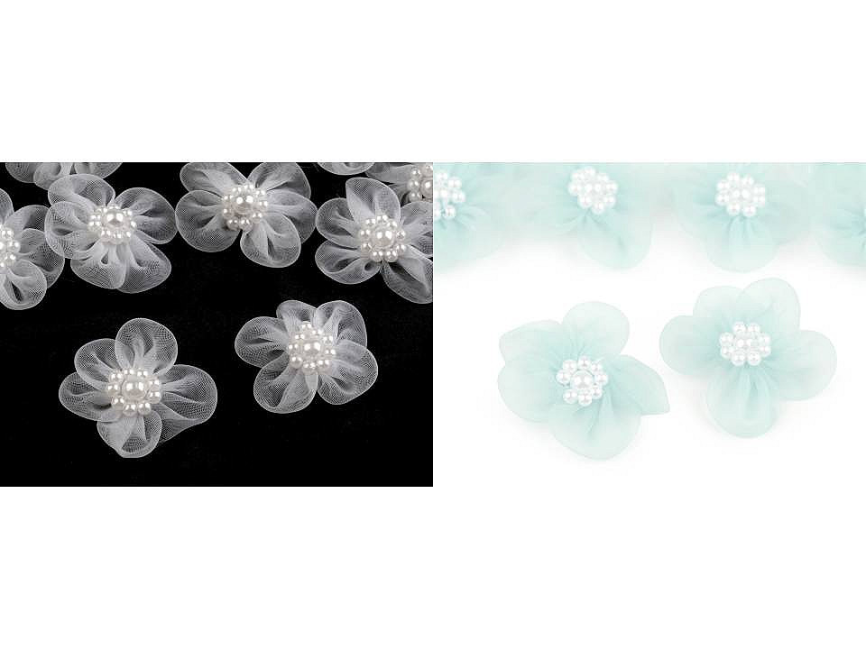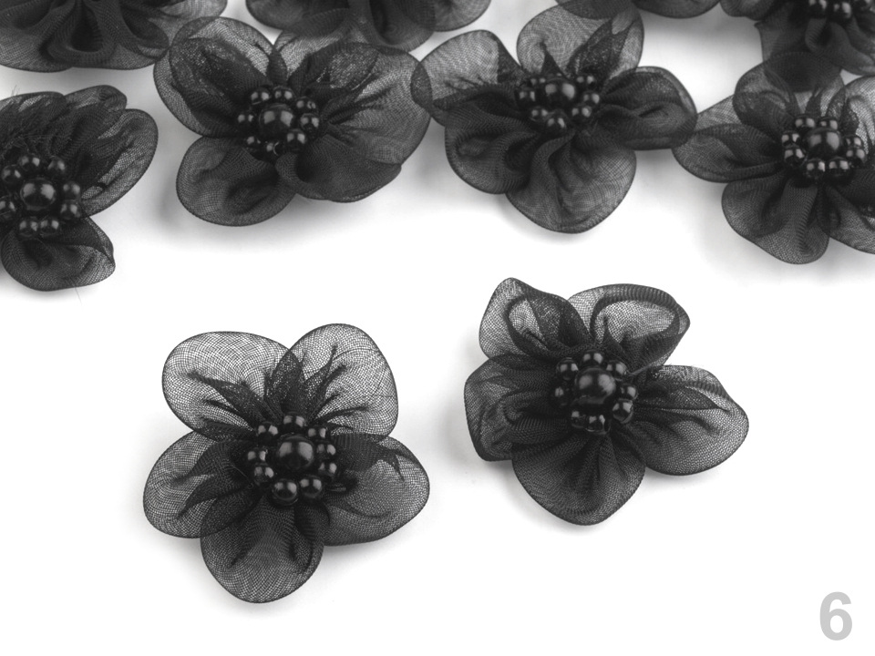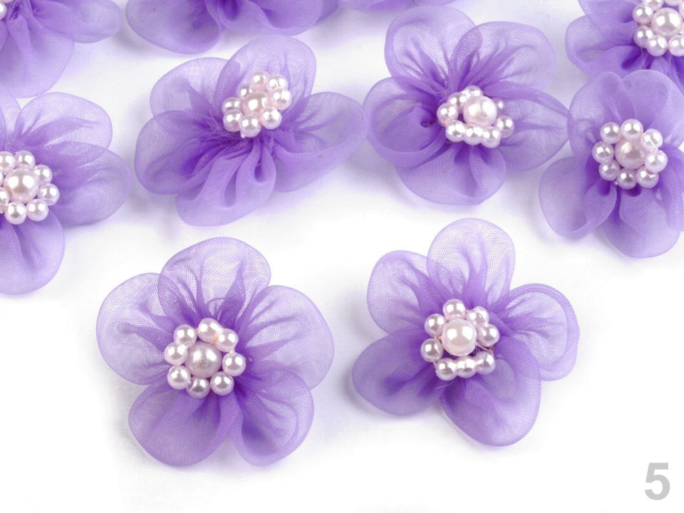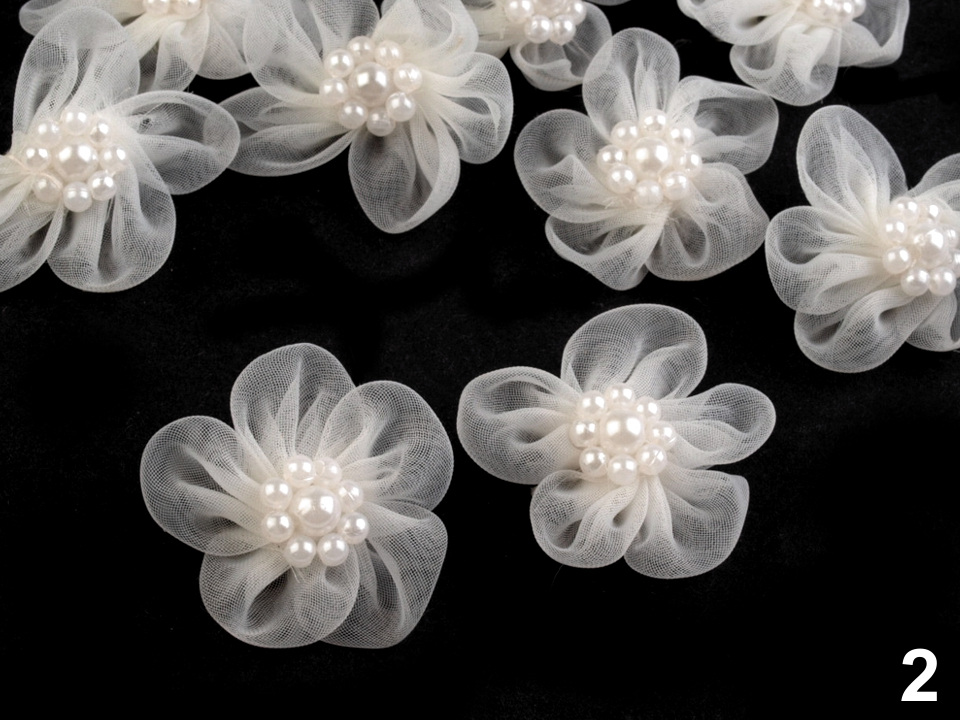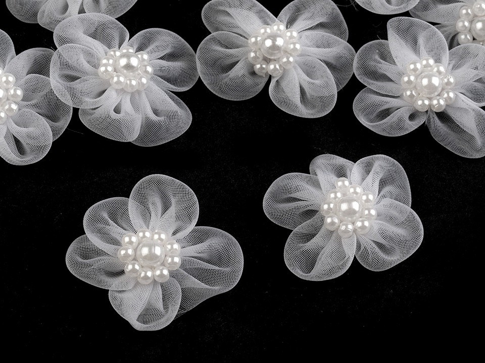 Jemný monofilový květ je velice vzdušný. V jeho středu jsou našité lesklé perličky.