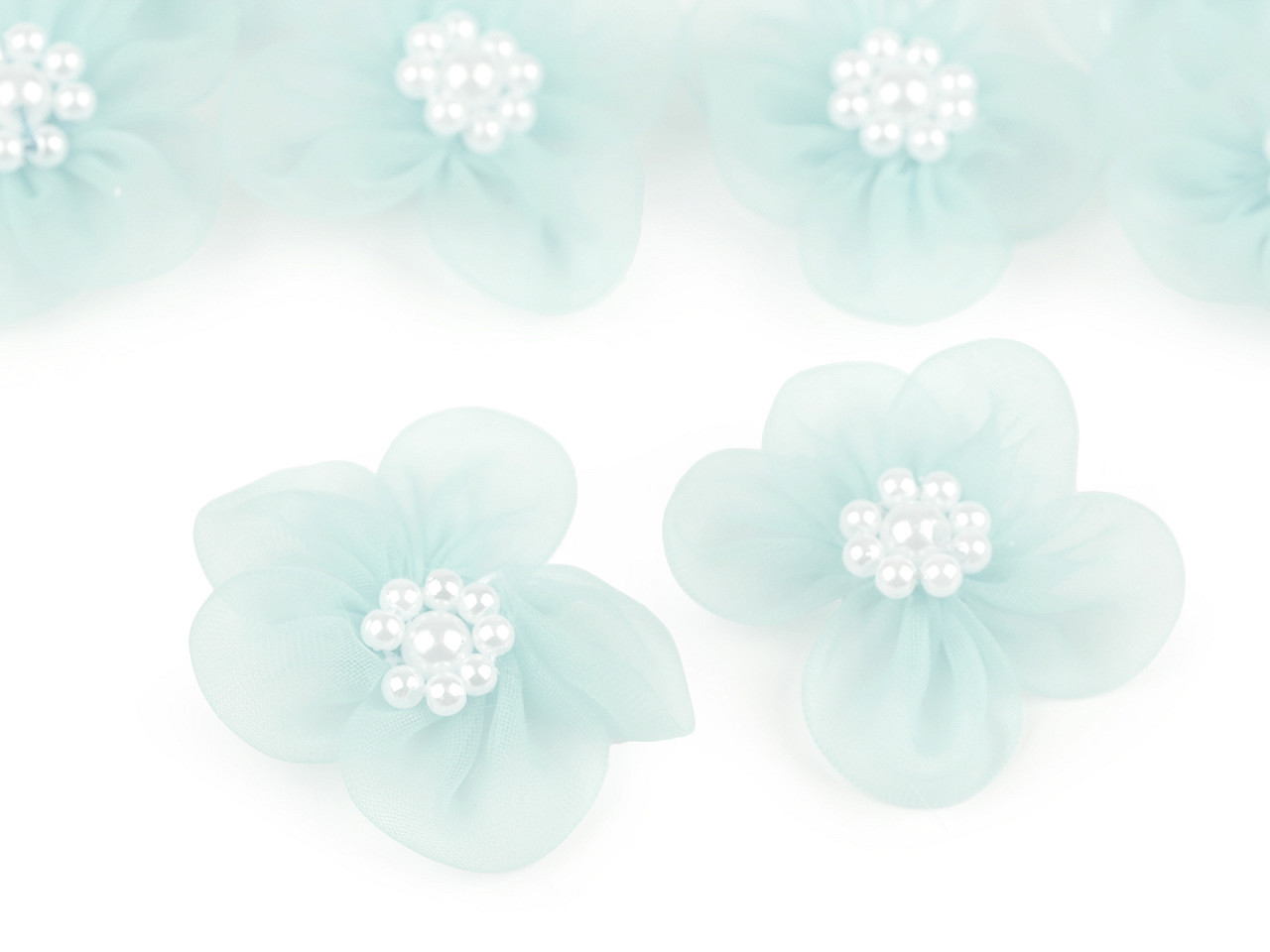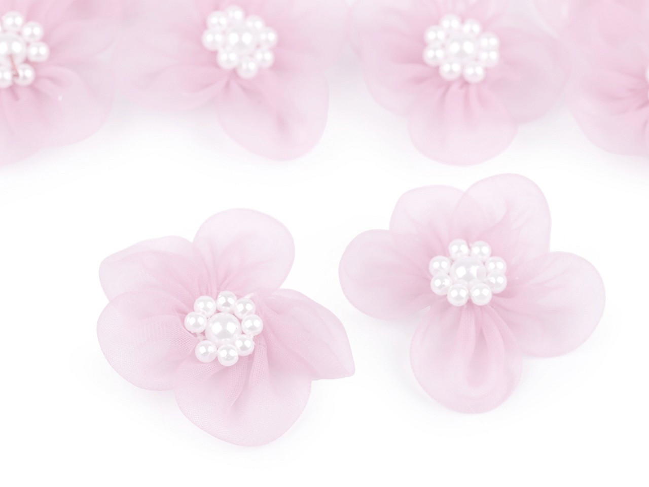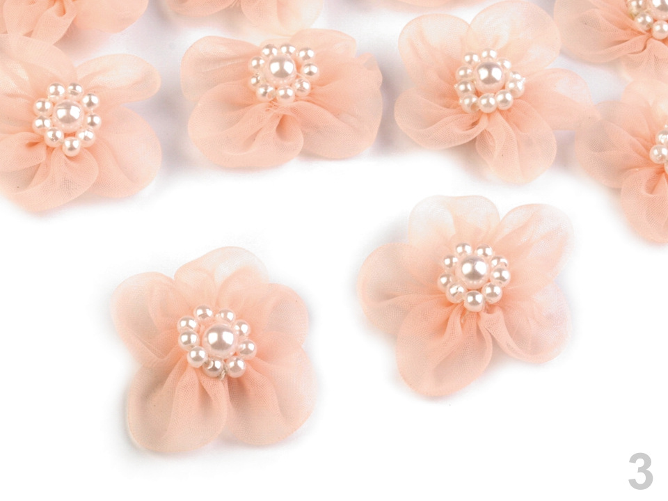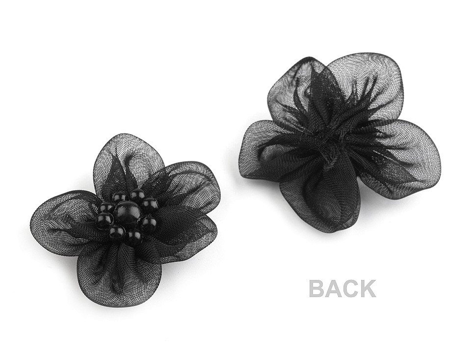 Jemný monofilový květ je velice vzdušný. V jeho středu jsou našité lesklé perličky.