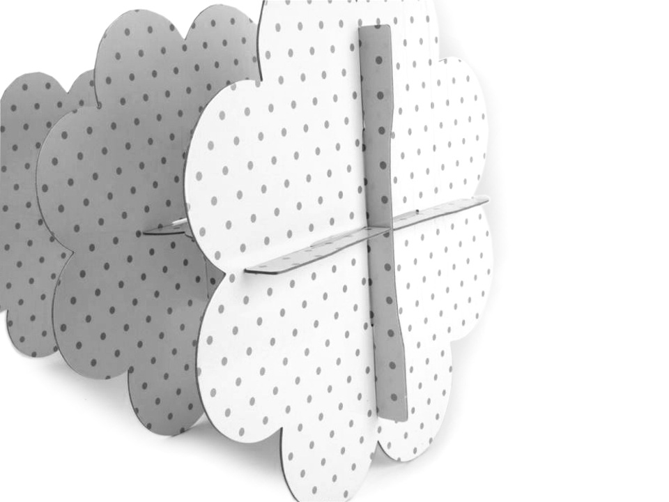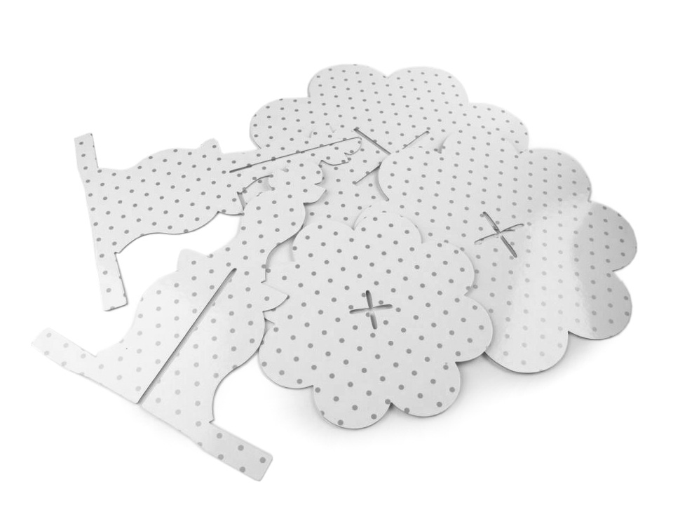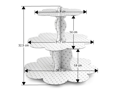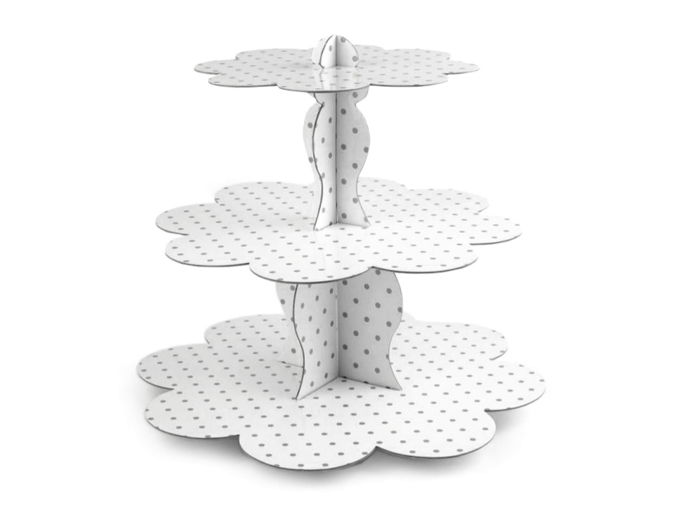 Třípatrový stojan je vyrobený z pevného kartonového papíru, který je potištěný puntíky. Využijete ho jako praktickou dekoraci na svatbách, oslavách, večírcích apod. Můžete na něj naskládat muffiny, košíčky, cupcakes a další dobroty.
