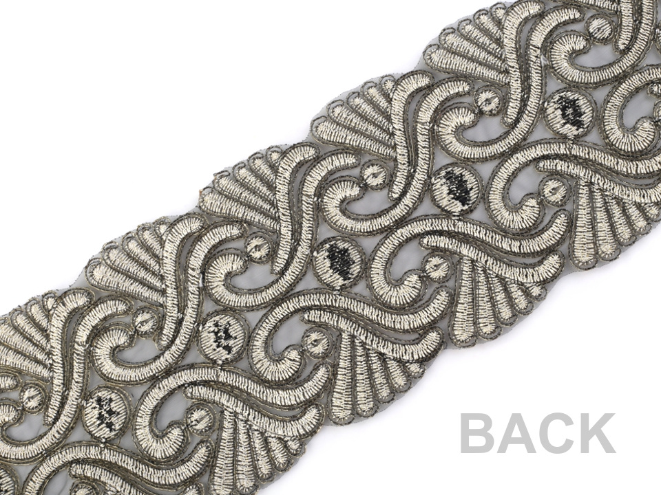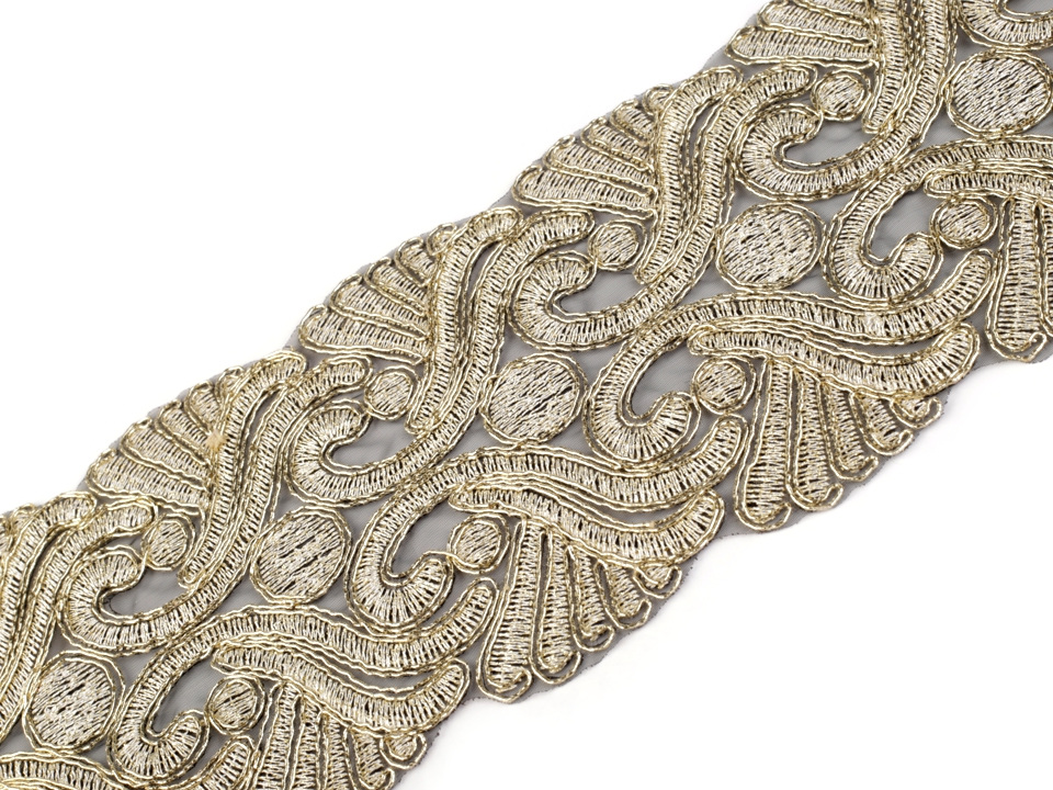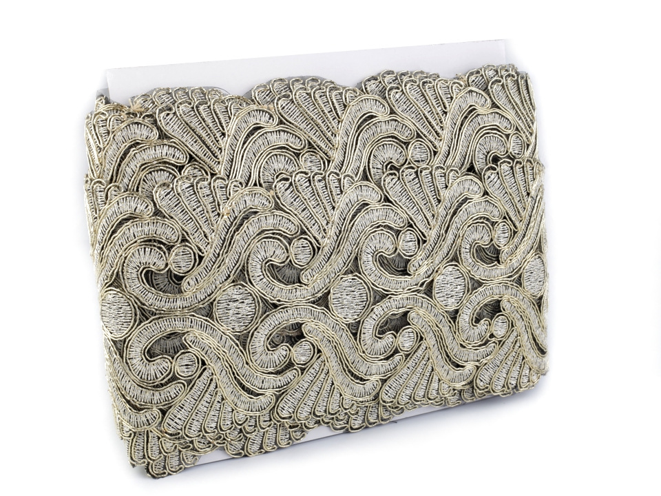 Vyšívaný prýmek zaujme svým barokním designem. Třpytivý lurex mu dodává slavnostní nádech.