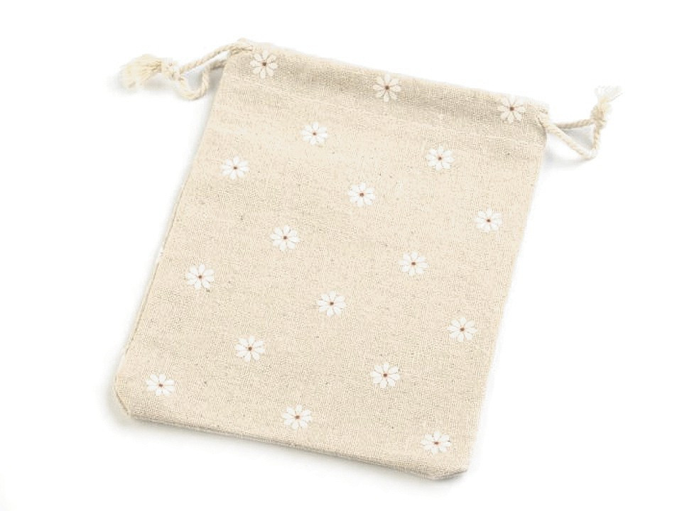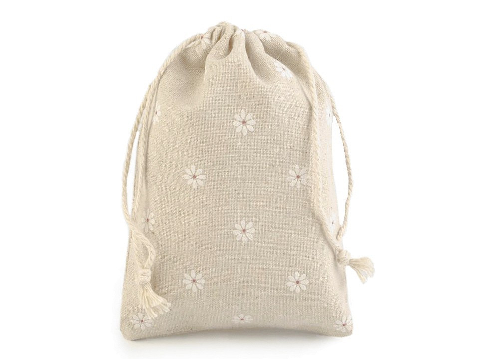 Přírodní lněný pytlík zdobí potisk drobných květů, které připomínají sedmikrásky. Je kvalitní a pevný. Snadno se uzavírá pomocí dvou bavlněných stahovacích šňůrek.