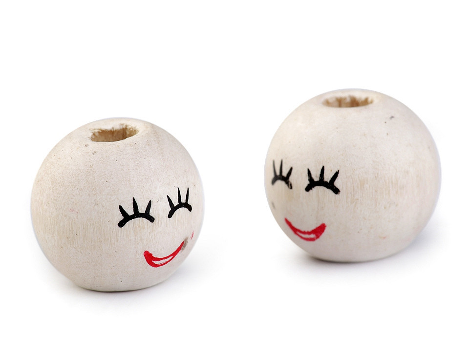 Dřevěné korálky s ručně malovaným obličejem. S jejich pomocí si můžete uháčkovat panáčka, vytvořit veselý náhrdelník, vyrobit prstové maňásky, veselé zápichy do květináče apod.