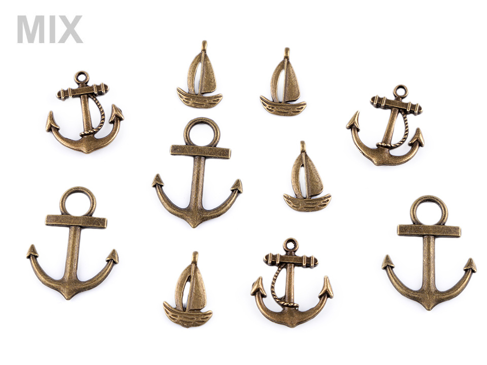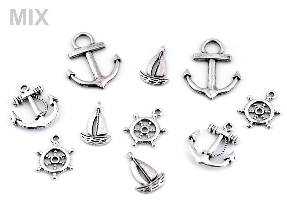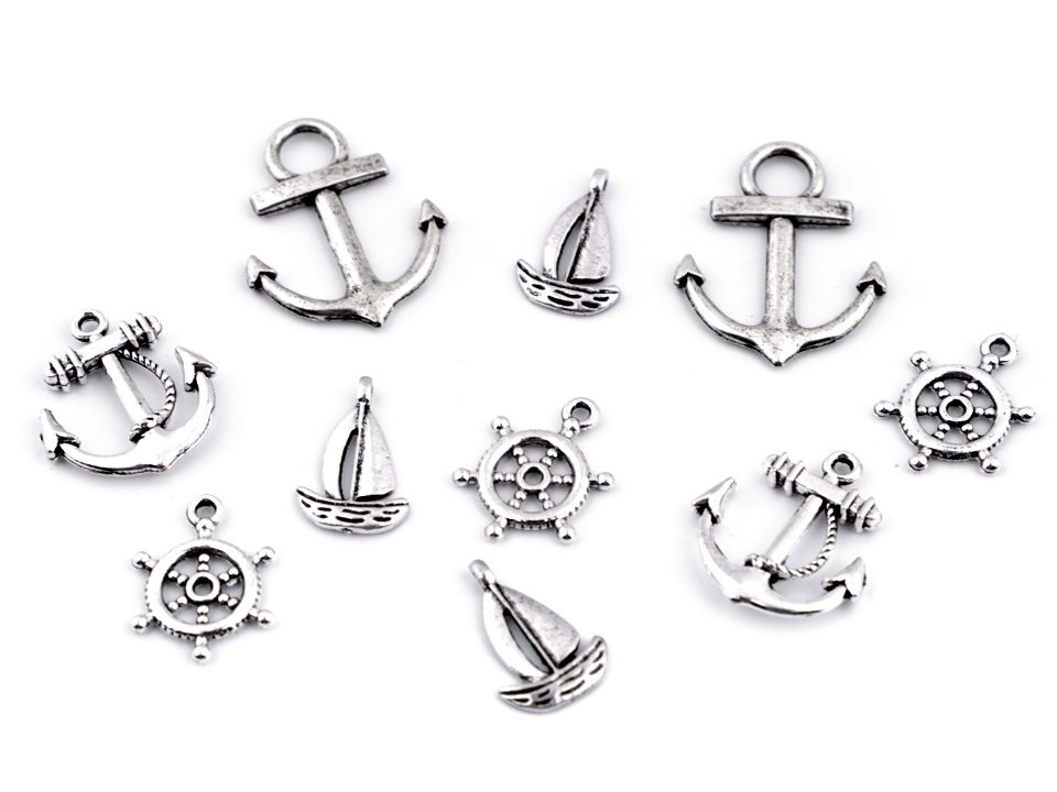 Mix kovových přívěsků s námořnickou tématikou. Můžete je použít jako přívěseky na náhrdelník nebo jako ozdoby do ketlovaných náramků. Dají se zavěsit pomocí šlupny nebo spojovacího kroužku na šňůru nebo řetízek.