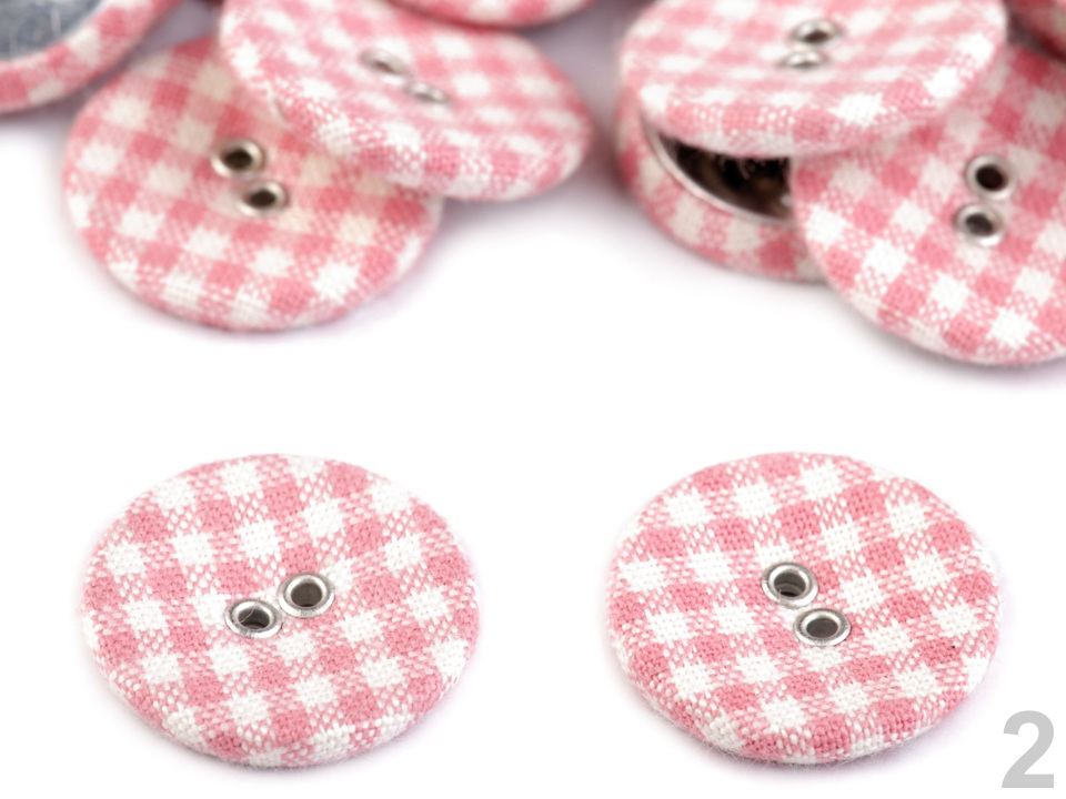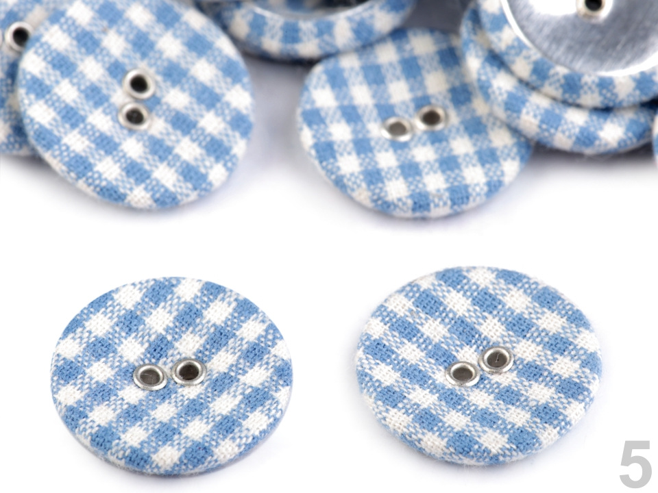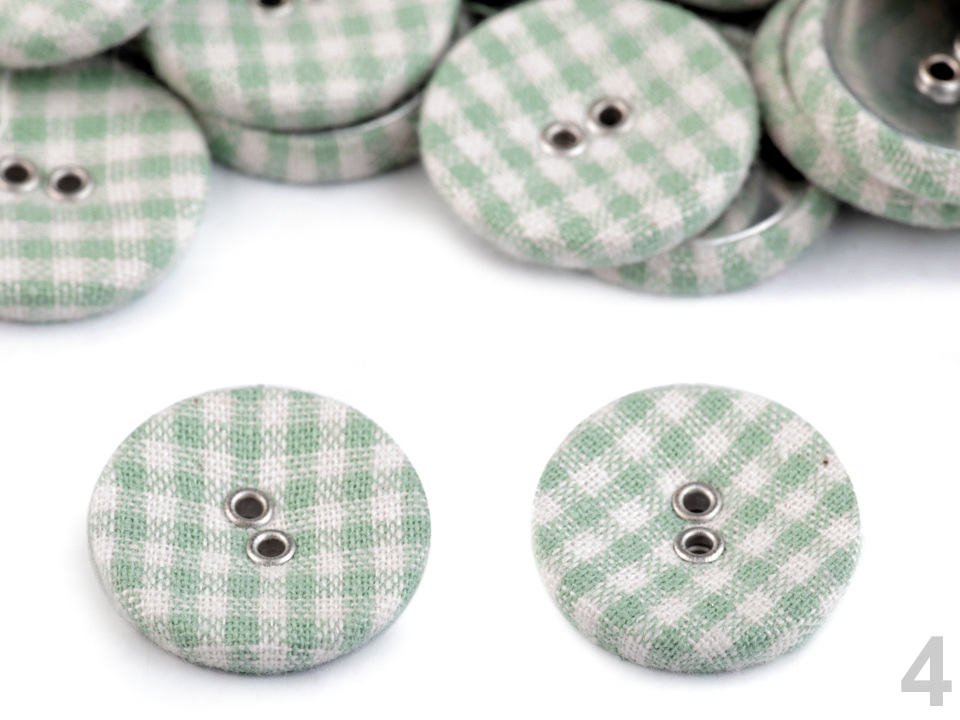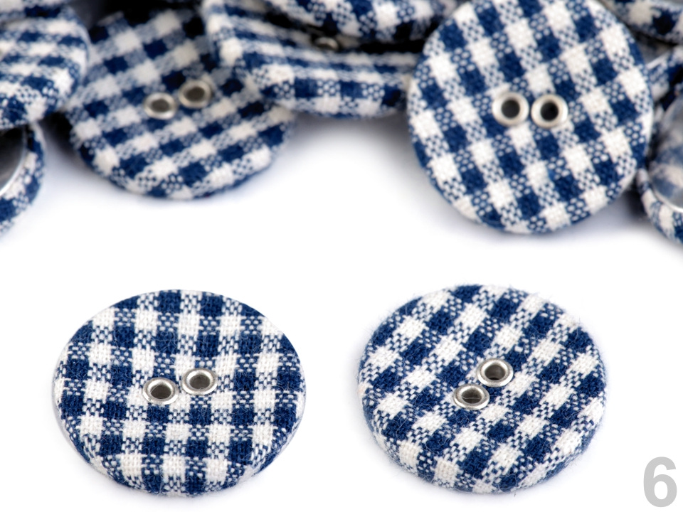 Dvoudírkové knoflíky jsou potažené károvanou látkou. Mají mírně vypouklý tvar. Můžete je našít na košile, svetry, mikiny, šaty apod.