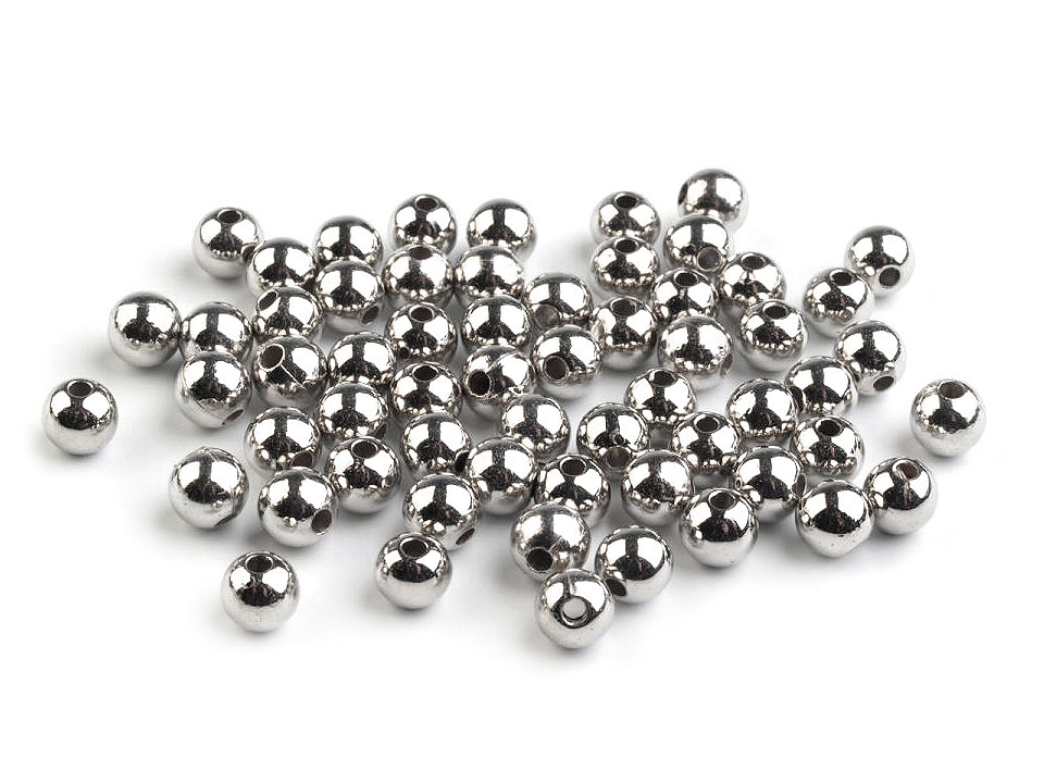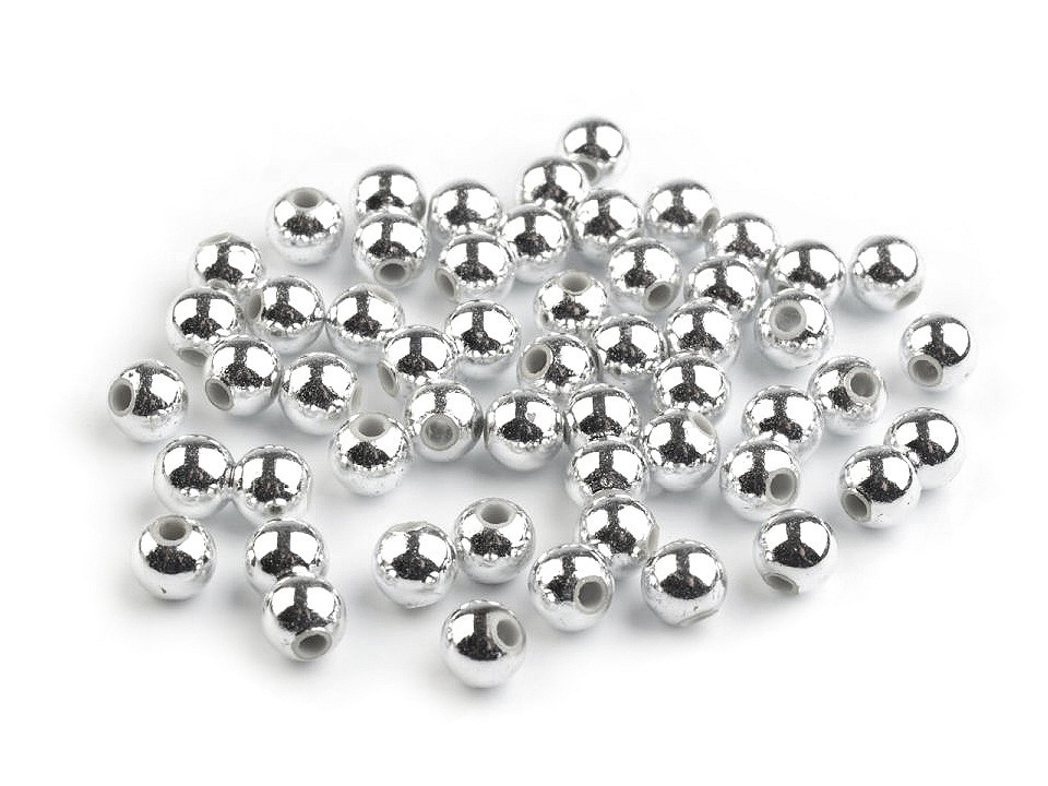 Výrazné plastové korálky ve tvaru kuličky s metalickou, vysoce lesklou úpravou na povrchu.
