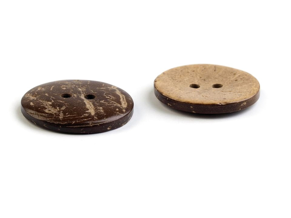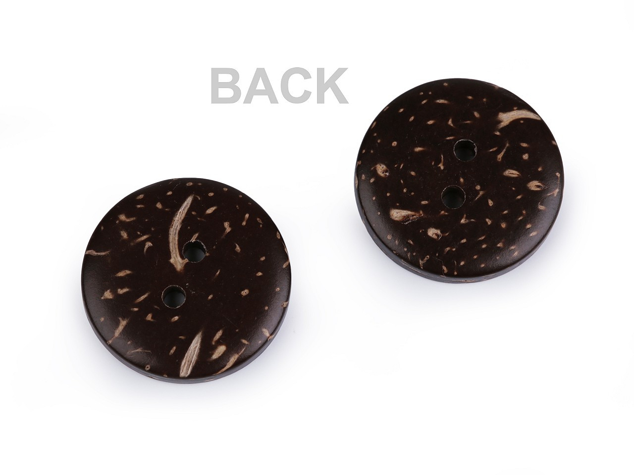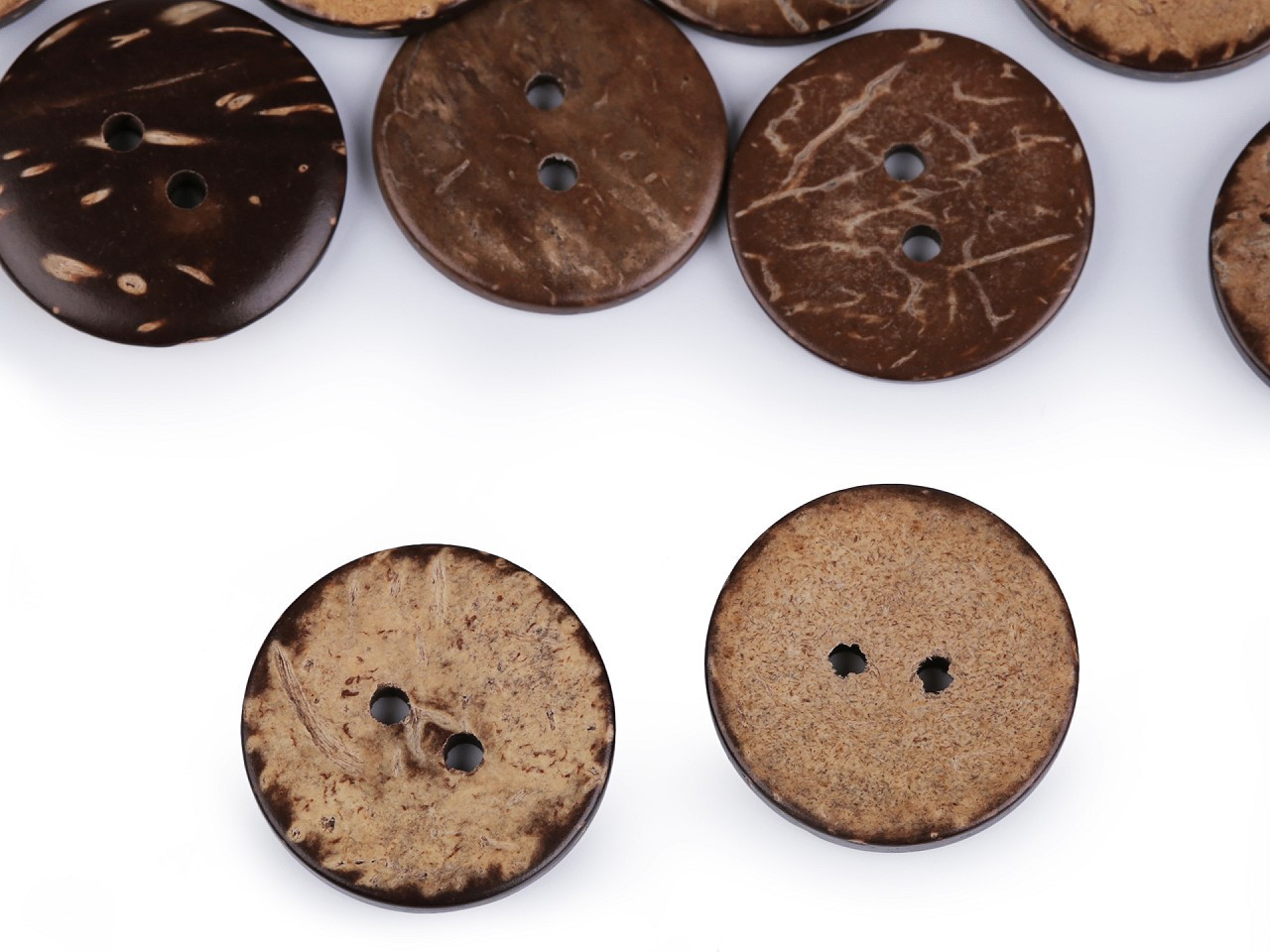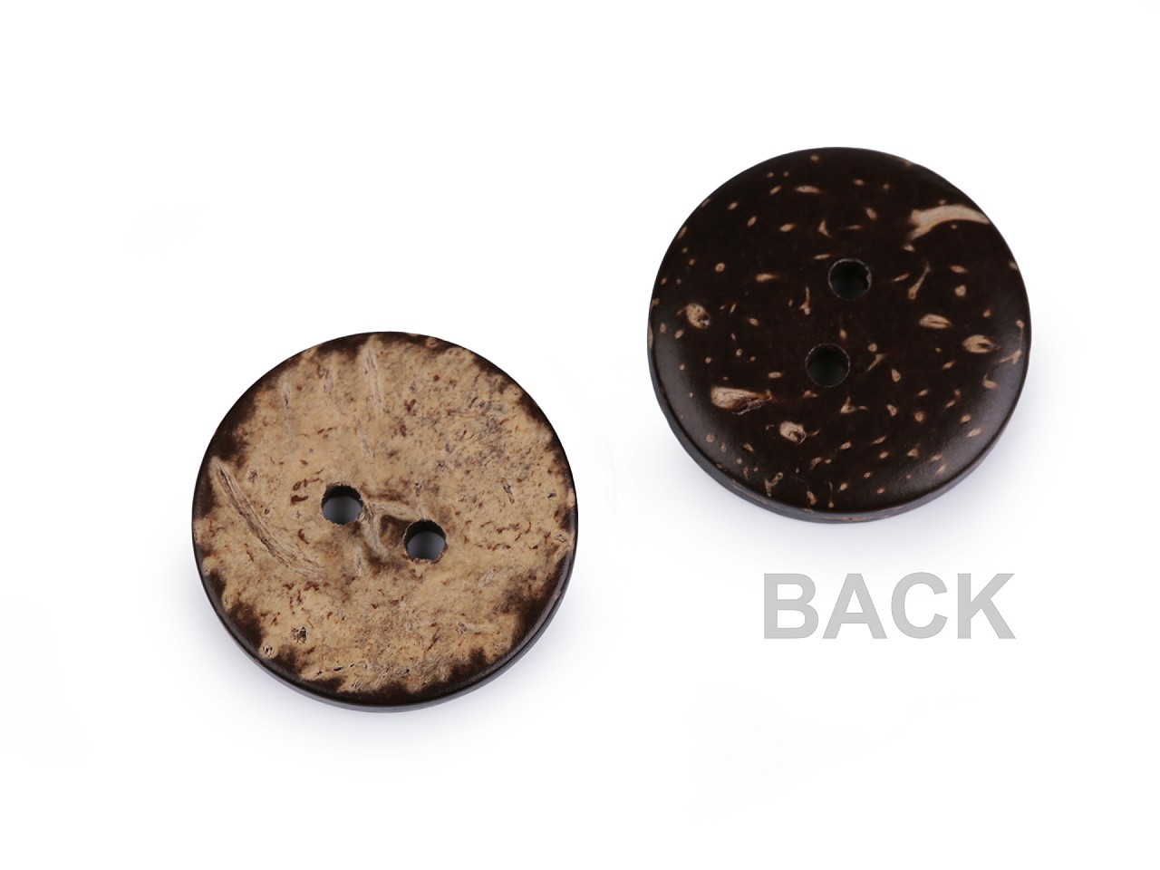 Kulaté dvoudírkové knoflíky působí exoticky, protože jsou vyrobené z kokosu. Můžete je použít oboustranně. Knoflíky využijete jako zapínání na košile, svetry, vesty, šaty či tašky.