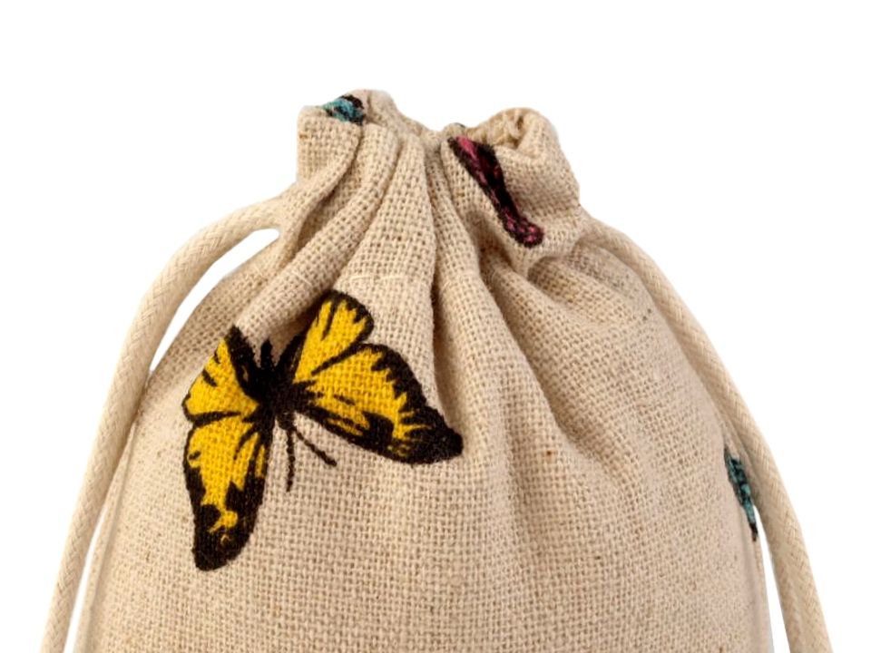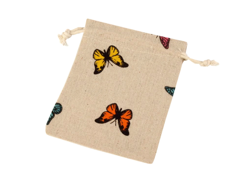 Malý pytlík je vyrobený z kvalitního a pevného materiálu. Snadno se uzavírá pomocí dvou bavlněných stahovacích šňůrek. Má veselý potisk s barevnými motýli.