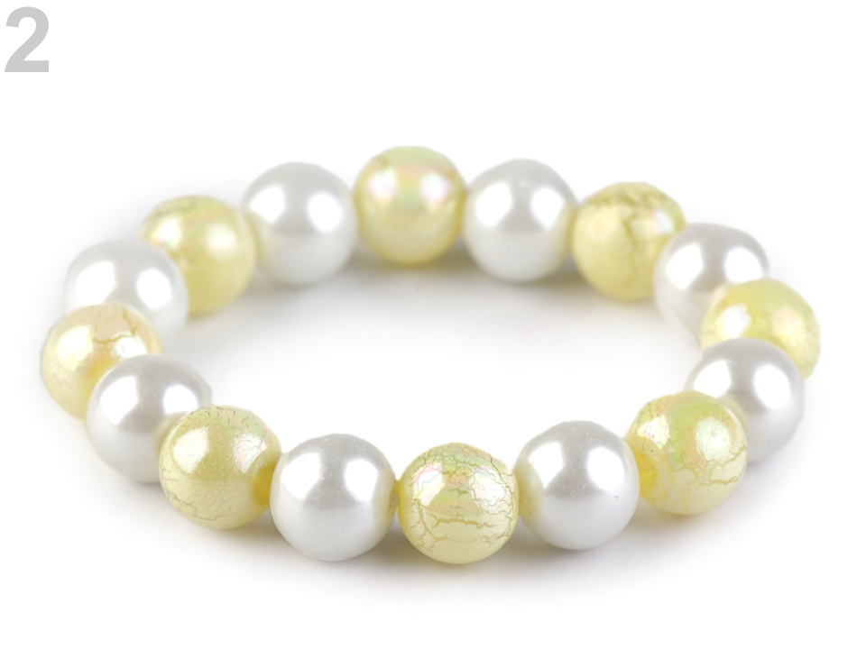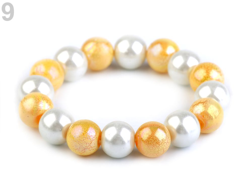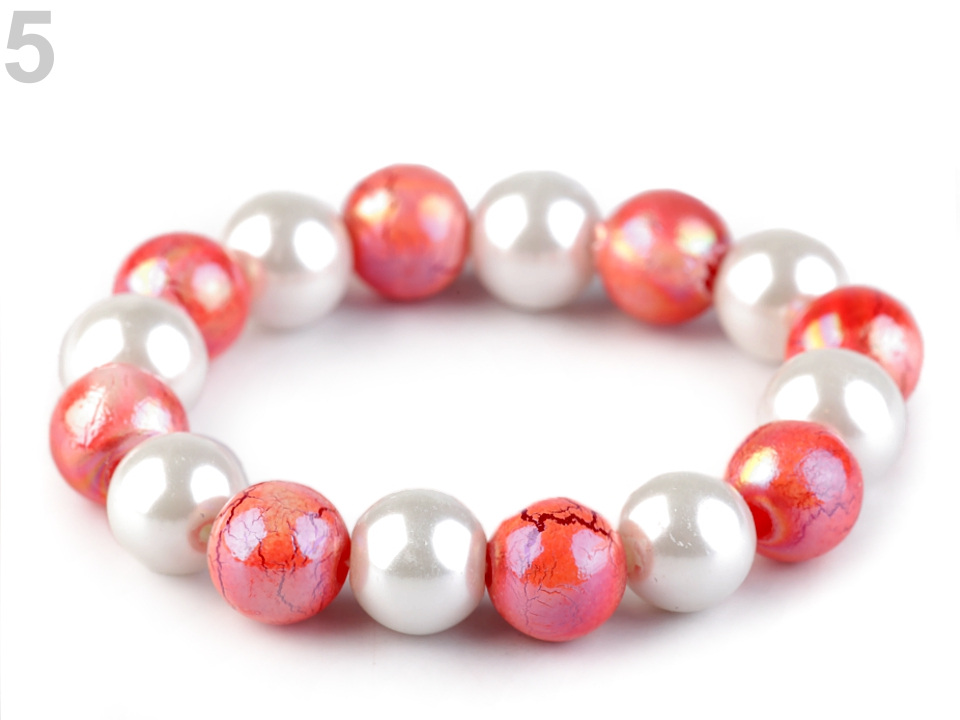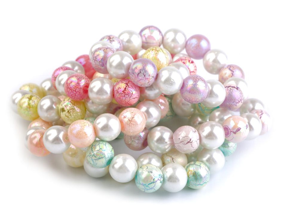 Voskované korálky se střídají s barevnými s popraskaným efektem. Díky pružence má univerzální velikost, snadno se natáhne na ruku. Náramek vám vkusně ozdobí zápěstí na společenských událostech, ale také si ho můžete vzít do práce k halence nebo kostýmku.