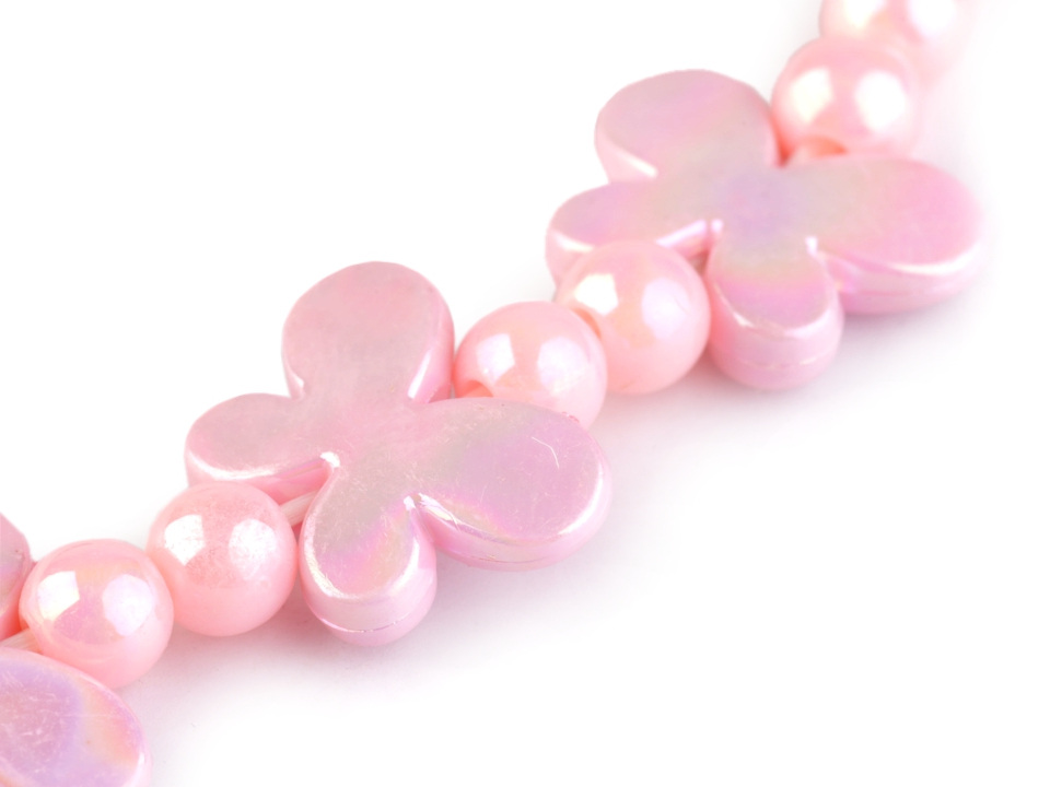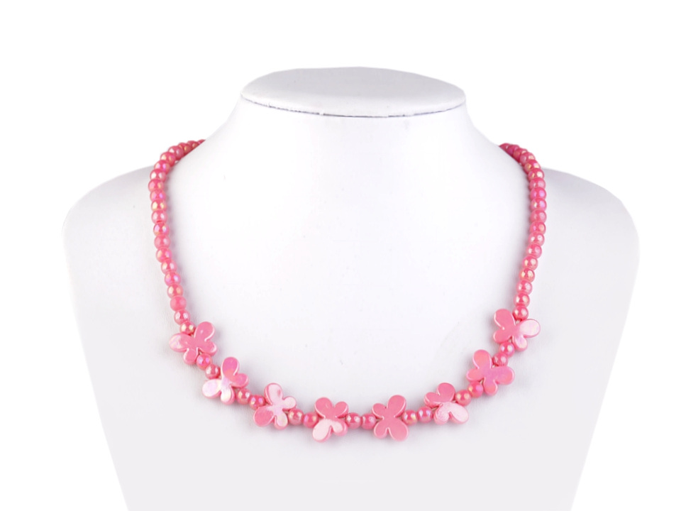 Plastové korálky jsou navlečené společně s korálky ve tvaru motýla na pružné gumičce. Náhrdelník ani náramek nemají uzávěry, jsou pružné a jdou pohodlně navléci. Korálky s motýlky mají jemný perleťový povrch, který se na světle zajímavě leskne.