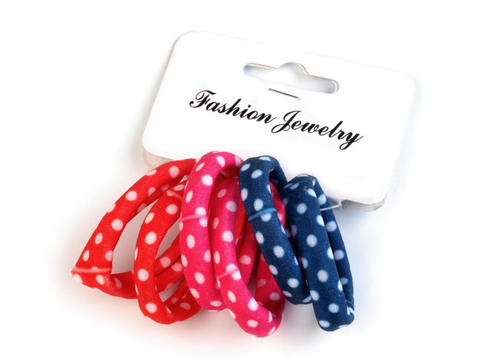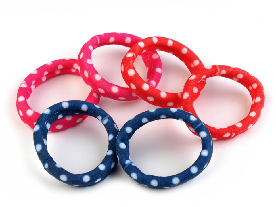 Gumičky do vlasů s retro puntíky vesele oživí účes. Jsou šetrné k vlasům. Výborně drží, jsou vhodné pro jemné i husté vlasy. Vnitřní průměr volně položené gumičky je cca 3 cm, maximální délka obvodu po roztažení je 25 cm.