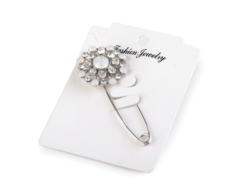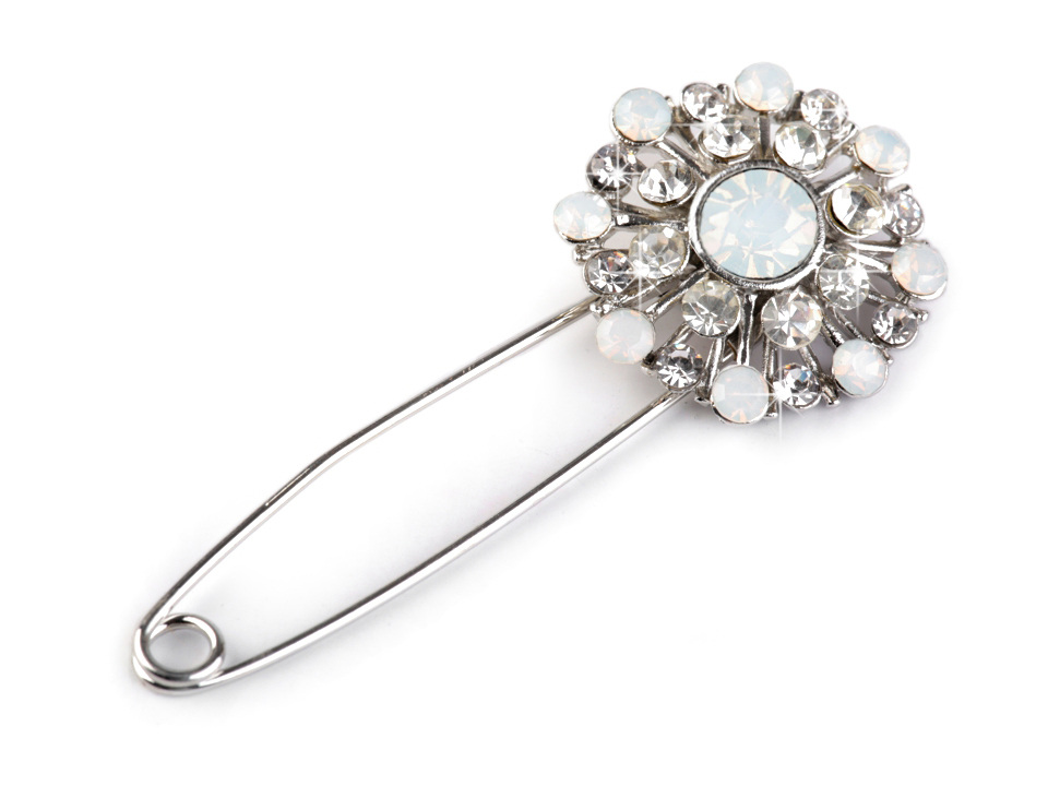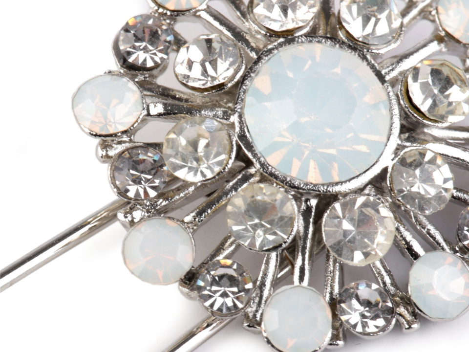 Brož ve tvaru květu na spínacím špendlíku je ozdobená broušenými kamínky. Oslnivě se třpytí. Část kamenů má barvu crystal, část je z mléčného skla s AB efektem.