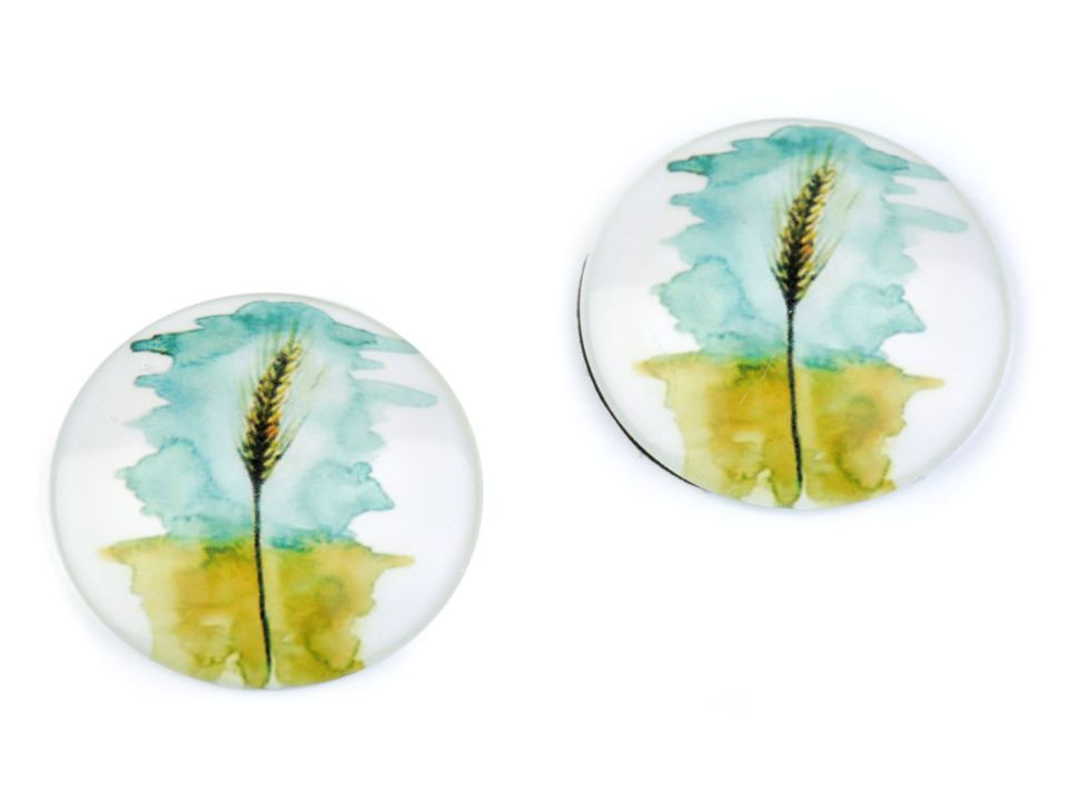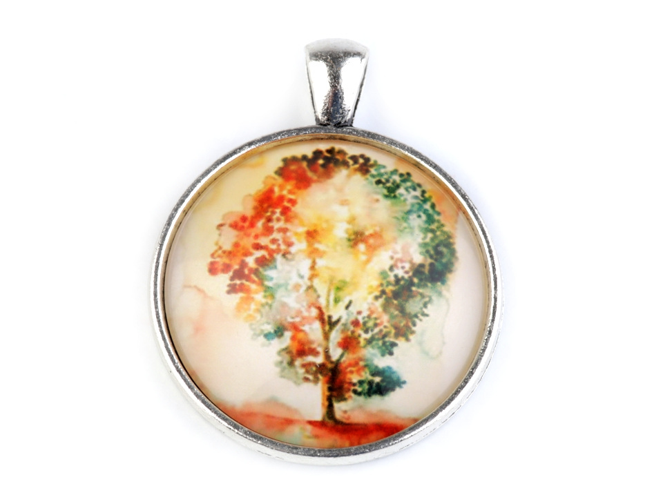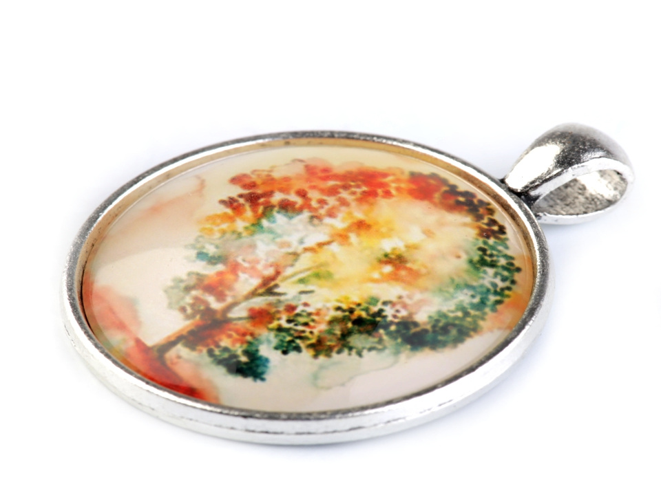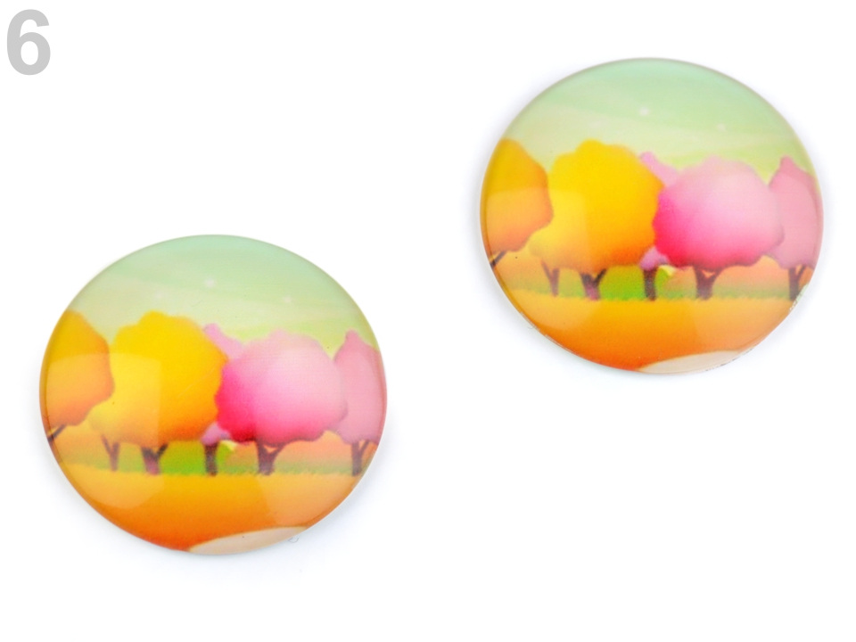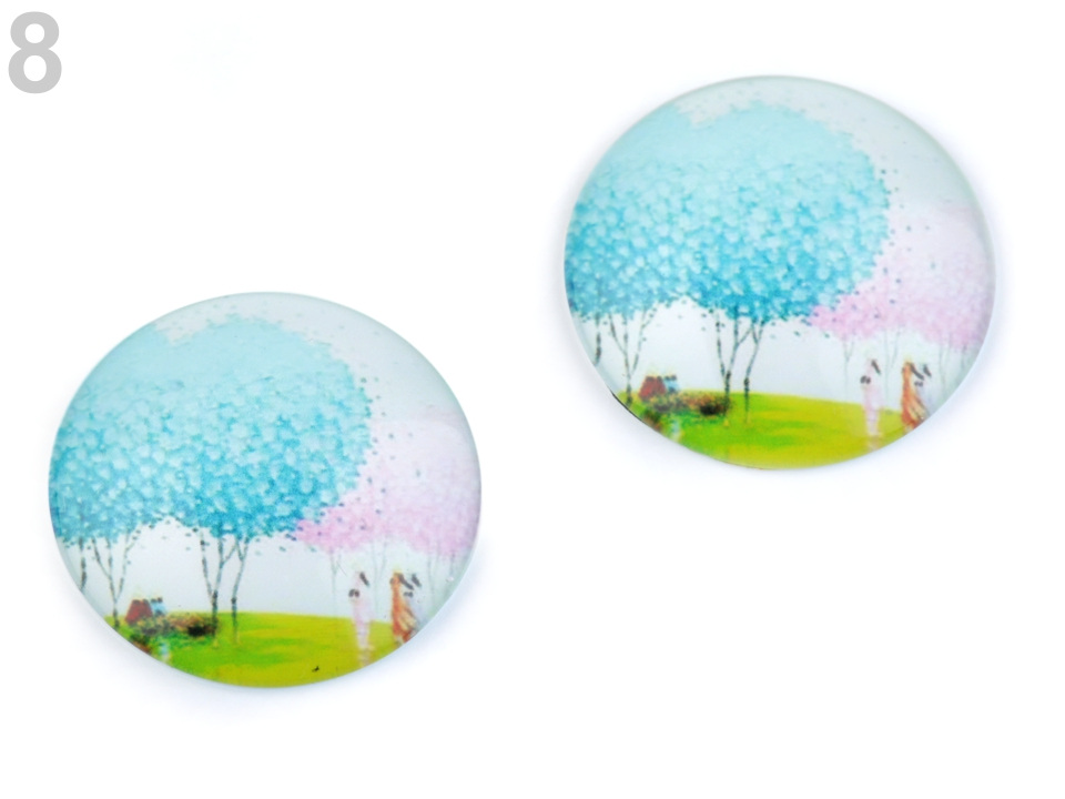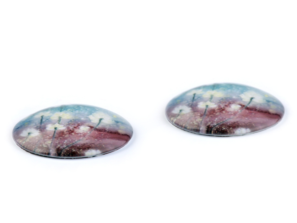 Kulatý skleněný kabošon s motivem stromů a květů.