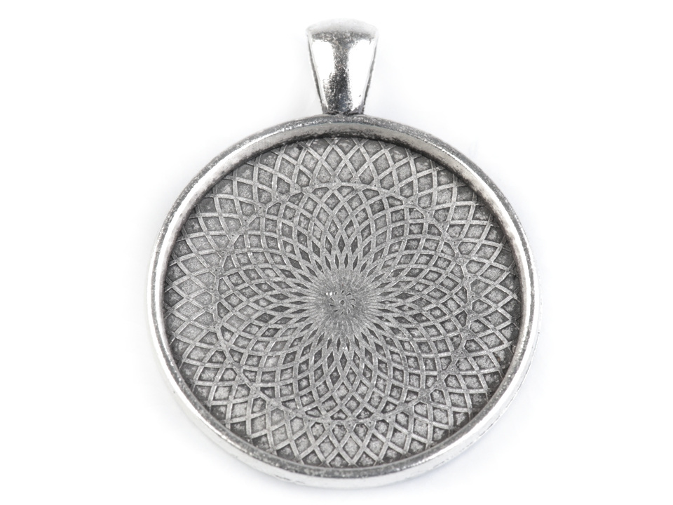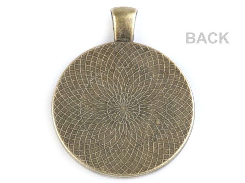 Kulaté kovové lůžko má nenáročný design. Uvnitř má reliéfní povrch do tvaru mandaly, díky kterého lepidlo pod kabošonem dobře přilne. Stejný motiv je i ze zadní strany přívěsku.