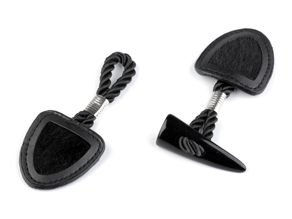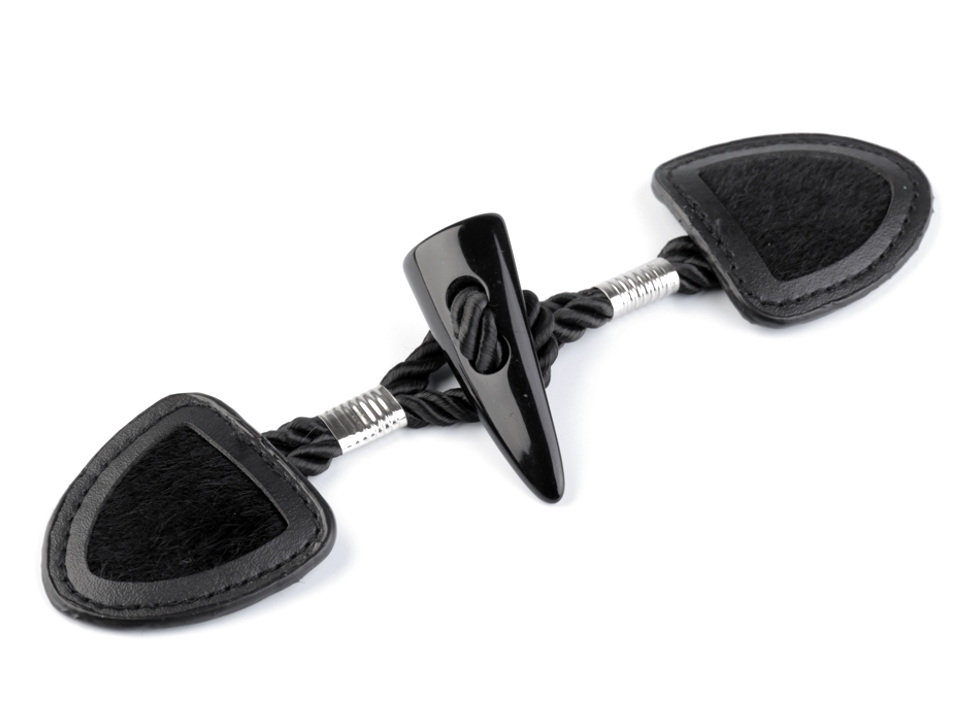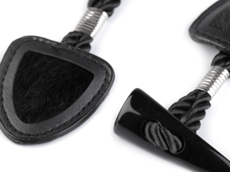 Celé zapínání je kvalitně a precizně zpracované. Patky na našití mají uvnitř vsadku, která věrně imituje zvířecí chlupatou srst. Dokola jsou olemované eko kůží. Poutka jsou z kroucené šňůry. Zapínají se na knoflík olivu.