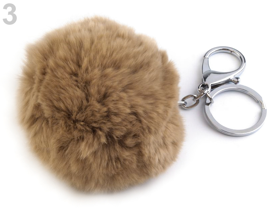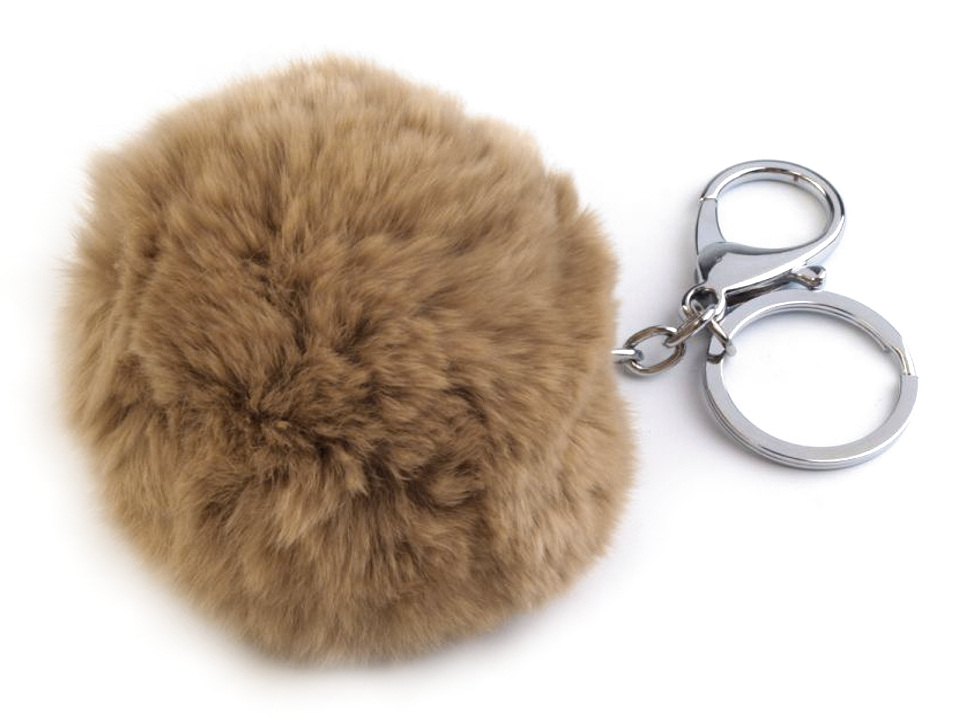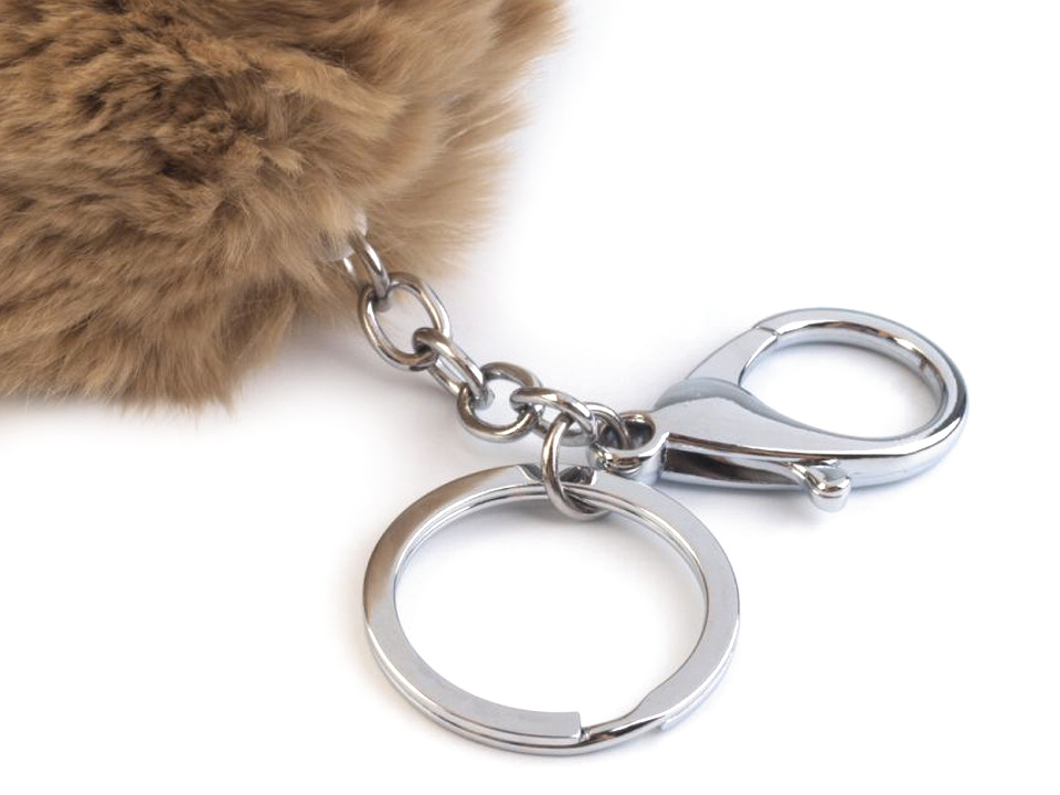 Kožešinová bambulka je jemná a velice příjemná na dotek. Je zavěšená na řetízku ke kterému je připojený plochý kroužek na klíče a otevírací karabina.