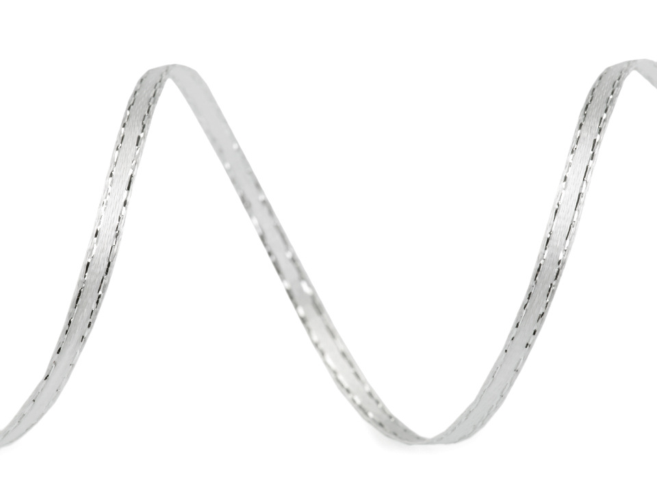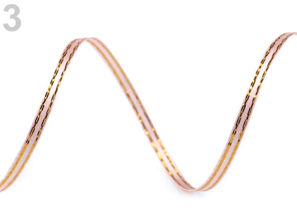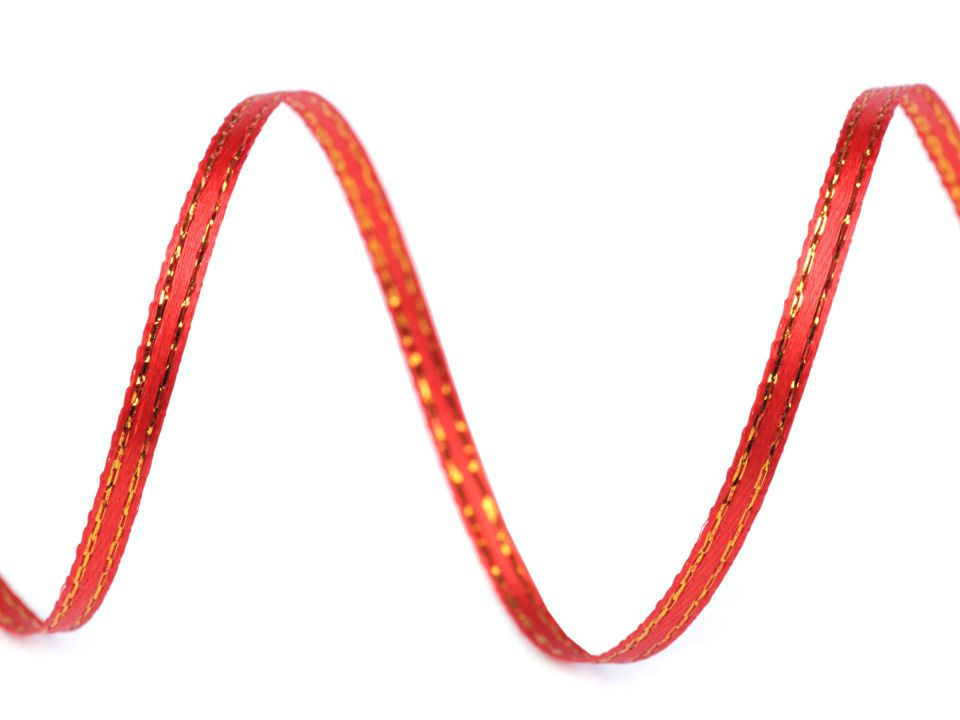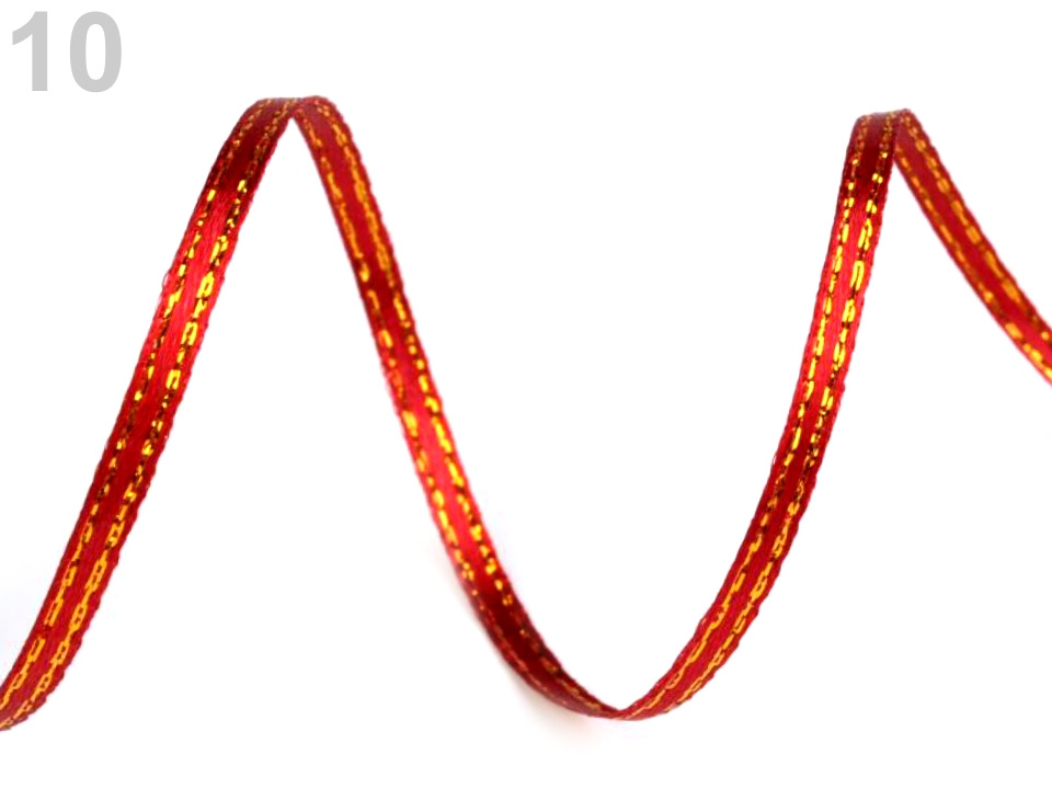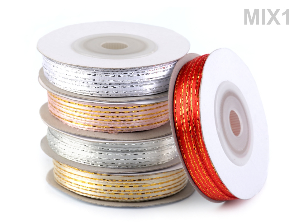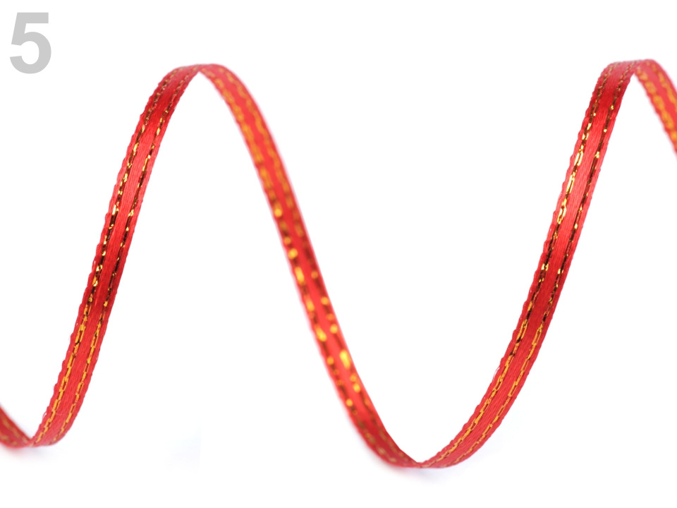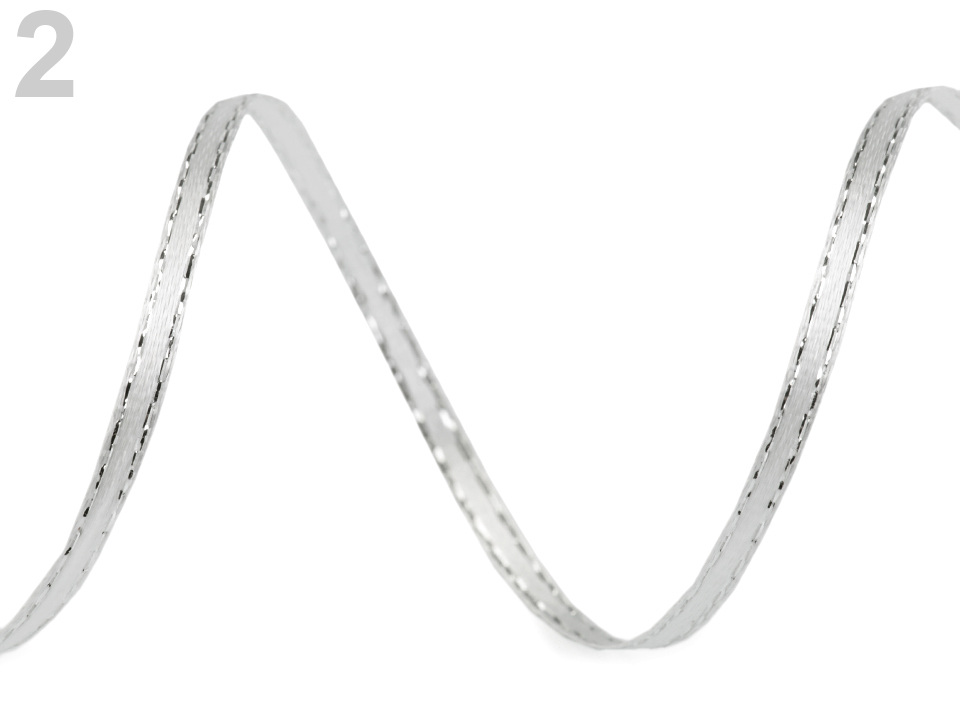 Lesklá atlasová stuha je ozdobena třpytivým lurexem, který jí dodává slavnostní vzhled.