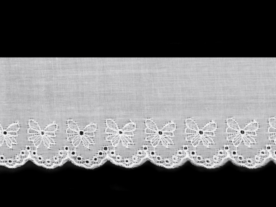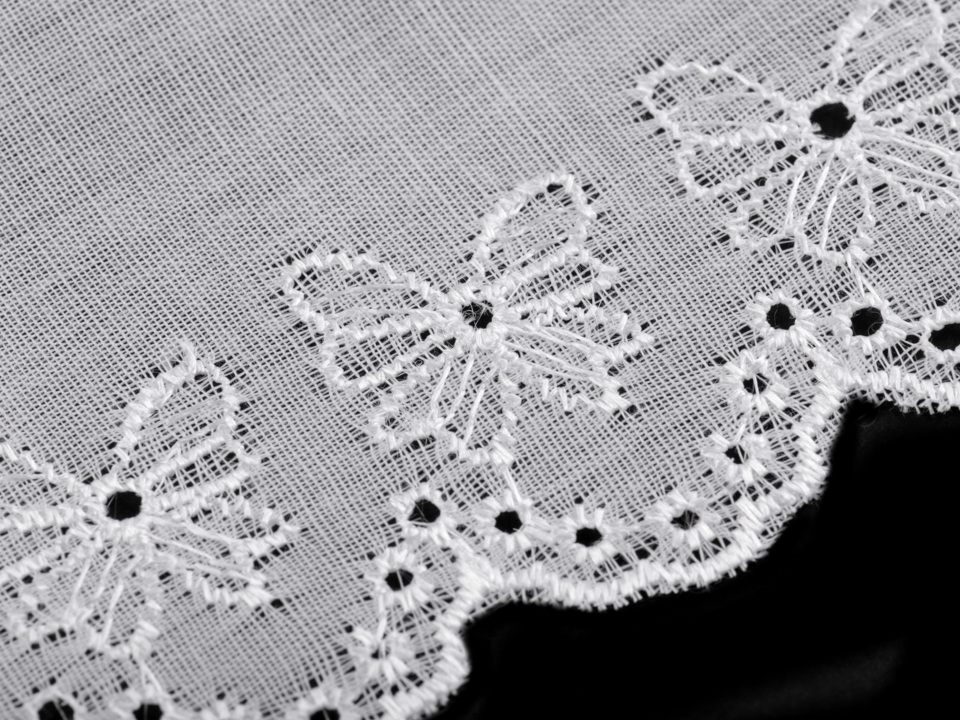 Madeiru zdobí jemný vzor s mašlemi a dírkovou výšivkou. Okraj zakončují obloučky.