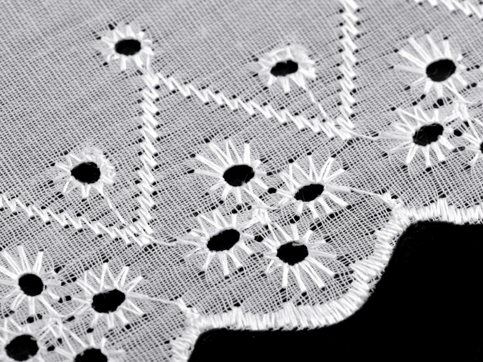 Bavlněnou madeiru zdobí v dolní části dírkovaná výšivka.
