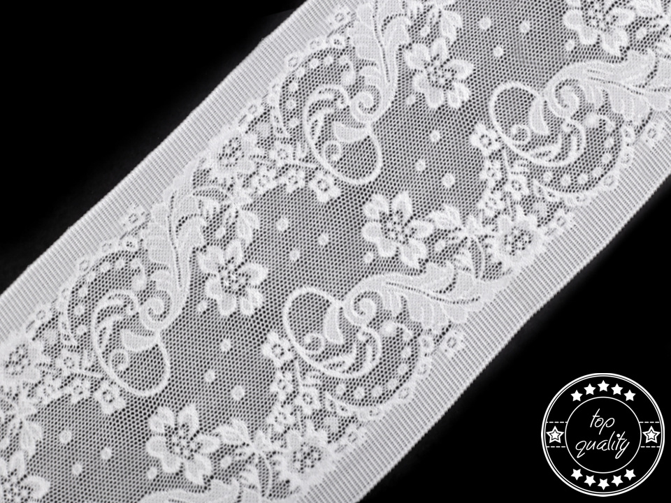 Široká pružná krajka s květinovými ornamenty vám originálně ozdobí oděvy nebo doplňky.