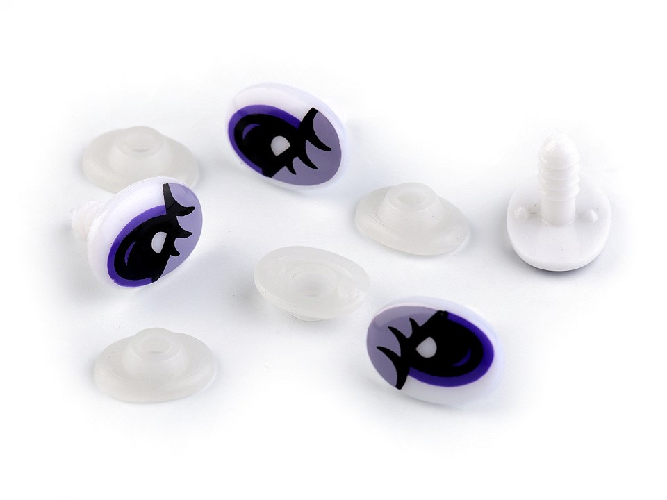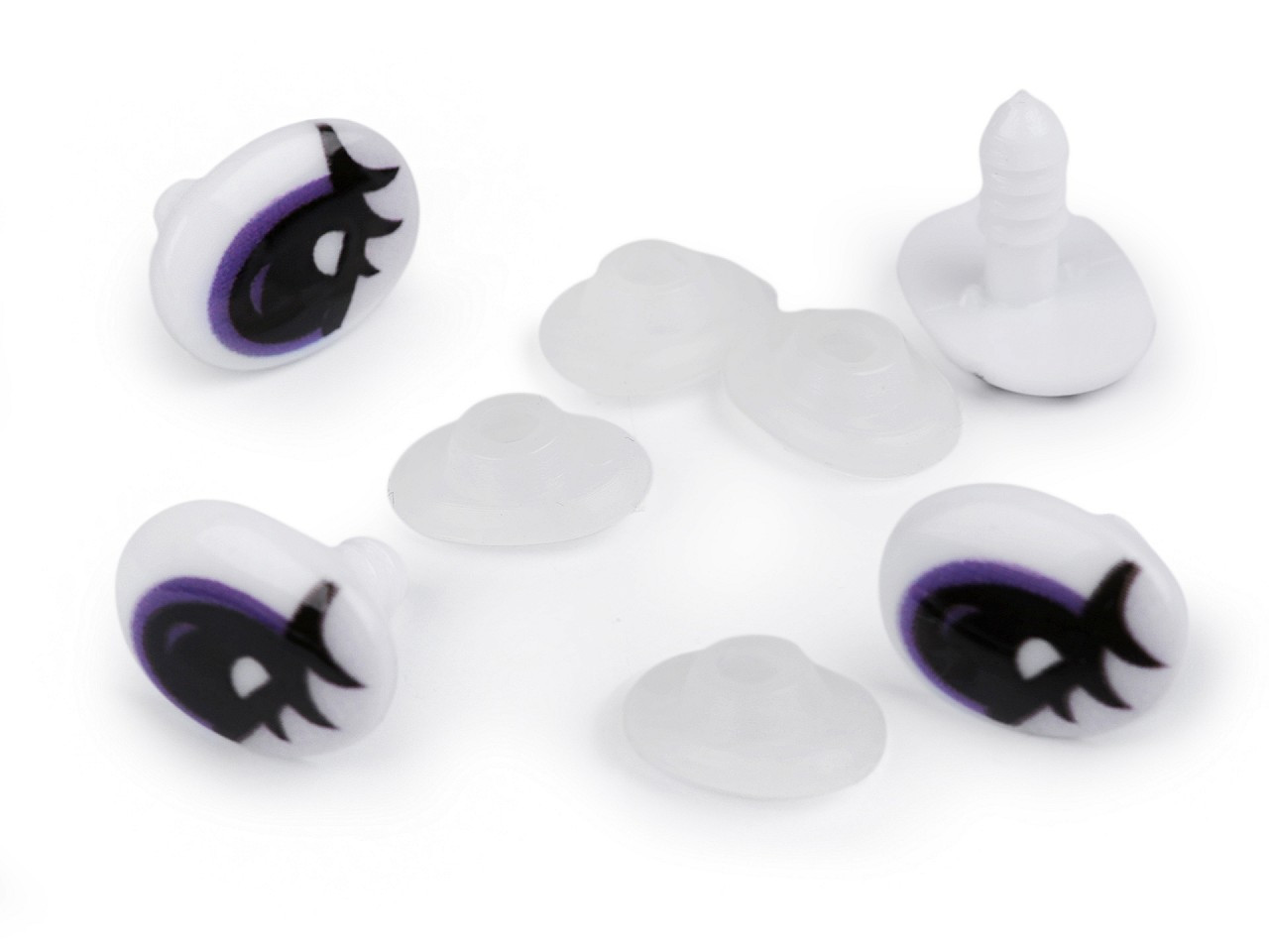 Plastové oči oválného tvaru s kvalitním barevným potiskem využijete pro výrobu různých zvířátek a postaviček např. plyšáků. Pro pevné přichycení mají oči na dříku závity, které se pevně uchytí v materiálu používaném při výrobě plyšáků. Z druhé strany se nacvakne pojistka, která oči bezpečně zachytí na místo.