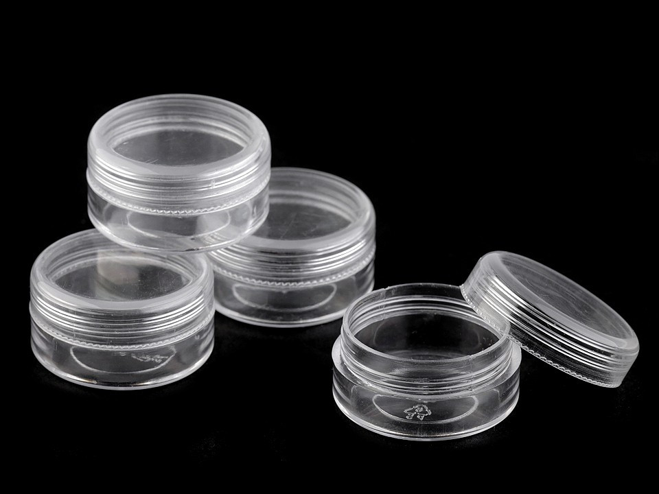 Plastová dóza je vyrobena z průhledného materiálu. Navíc je vybavena šroubovacím víkem, proto se nemusíte bát rozsypání. Využijete ji na korálky, flitry či další drobnosti potřebné pro bižuterii.